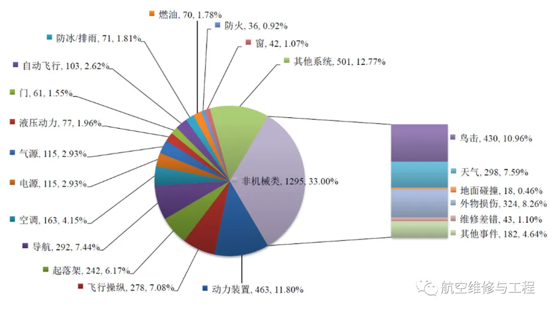 根据航空器使用困难报告系统统计,2020年国内按CCAR-121部运行的航空公司共报告SDR 3924起,比2019年减少1496起,增长率为-27.60%;其中机械类SDR 2629起、非机械类SDR 1295起,分别比2019年减少846起和650起,增长率为-24.35%和-33.42%;SDR千时率、机械类SDR千时率和非机械类SDR千时率分别比2019年增加1.33%、增加5.89%和减少6.8%。从图4中可看出2020年度占机械类SDR前三位的是动力装置(11.80%)、飞行操纵系统(7.08%)和起落架系统(6.17%)。