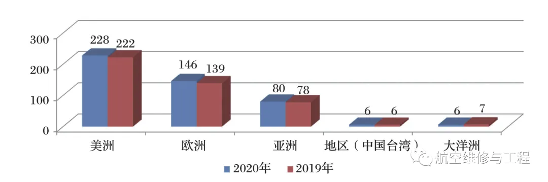 截至2020年底,CAAC批准的维修单位总数为964家,其中国外/地区维修单位为466家,国内维修单位为498家(包括57家运输航空公司的维修单位),总数比2019年底减少14家。CAAC认可的JMM维修单位共135家(包括香港和澳门地区20家)。CAAC批准的国外/地区维修单位为466家,比2019年底增加14家,如图5所示。与2019年底相比,2020年欧洲地区维修单位数量增加7家,数量达到了146家,占比为31.33%;美洲地区增加6家,维修单位数量为228家,占48.93%;亚洲地区增加2家,大洋洲地区减少1家,中国台湾地区数量保持不变。