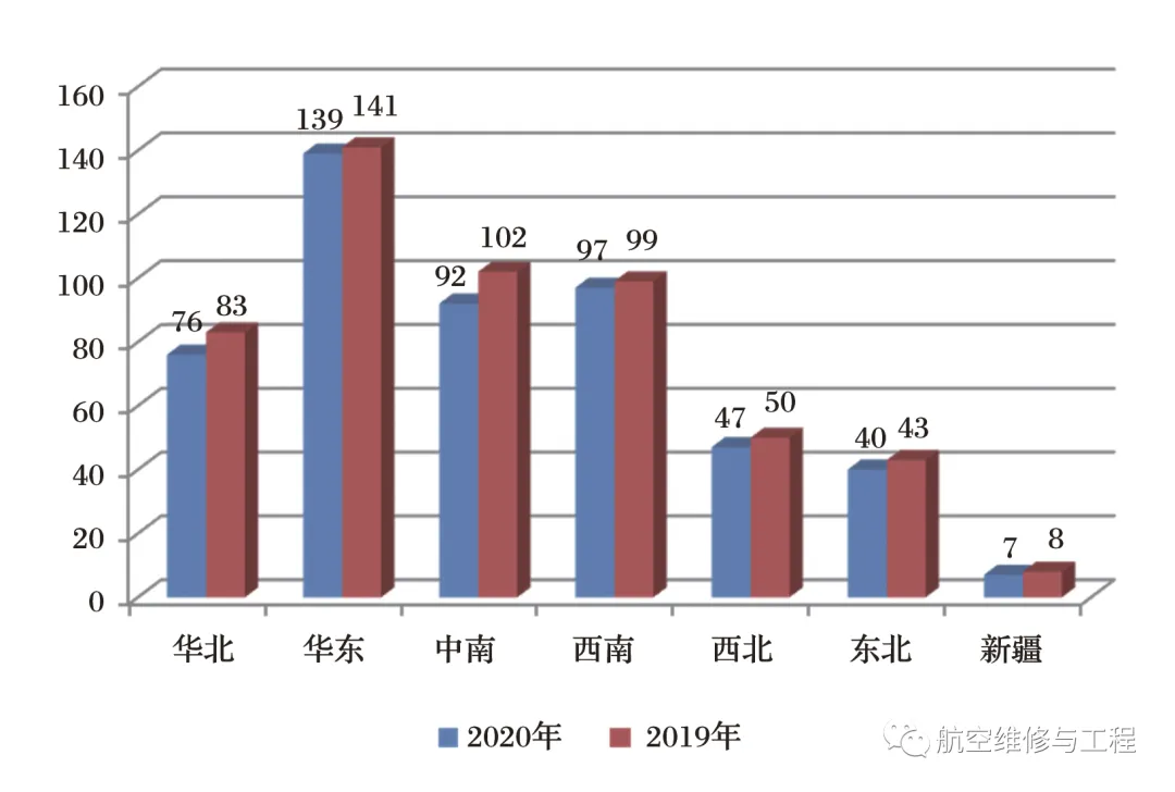 2020年底CAAC批准的国内维修单位数量为498家,较2019年底减少28家,增长率为-5.32%,主要原因为民航维修行业“多证合一”政策的实施,导致国内维修单位持证数量大幅减少。与2019年底相比,国内7个地区维修单位数量都有所减少,其中中南地区减少10家,华北地区减少7家,西北和东北地区各减少3家,华东和西南地区各减少2家,新疆地区减少1家,如图6所示。