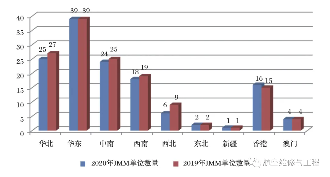 2020年底CAAC认可的JMM维修单位共135家,比2019年底减少6家。其中内地115家,比2019年底减少7家;澳门地区4家,与2019年底持平;香港地区16家,比2019年底增加1家。各地域JMM维修单位数量分布情况如图8所示。