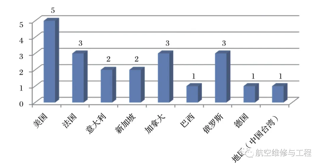 2020 年底国外/地区维修培训机构共21家,如图9所示,除俄罗斯增加2家外,其他国家/地区均与2019年底持平。CAAC批准的国外/地区维修培训机构的培训类别主要是机型培训,见表1。