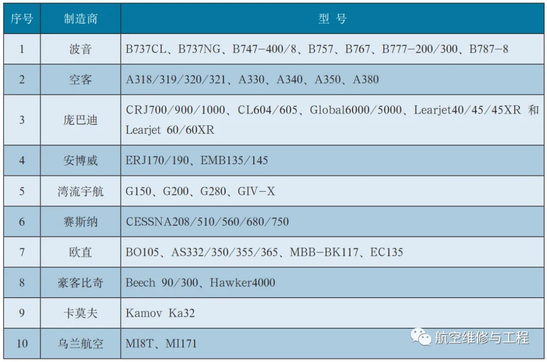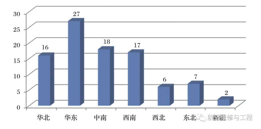 表1 CAAC批准国外/地区维修培训机构提供机型培训所涉及的主要机型国内华东地区维修培训机构数量最多,27家;其次是中南地区,18家;两个地区占国内总量的48.39%。2020年华东、西南、华北、中南和东北地区分别增长7家、5家、4家、2家和1家,西北和新疆地区与2019年同期持平,详细数据如图10所示。