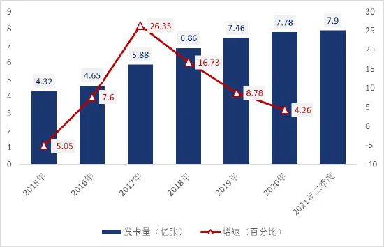 2021年以来,随着疫情后的消费复苏、国内经济逐渐回暖、央行取消信用卡透支利率上下限管理等政策出台,信用卡行业的各项指标不断提升,如今已经成为我国居民使用最广泛的非现金支付工具。