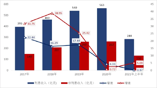 从信用卡交易与收入方面看,《报告》显示,招商银行在2021年上半年全国性银行信用卡交易额中排名最高,其次是平安银行。另外,招商银行在2021年上半年的业务收入位居部分已披露数据的银行之首。值得注意的是,从招商银行披露的数据看,非利息收入的增长在近年来逐渐成为一种趋势。具体来看,2021年上半年,该行实现信用卡利息收入284.25亿元,同比增长0.17%;实现信用卡非利息收入132.37亿元,同比增长5.09%。
