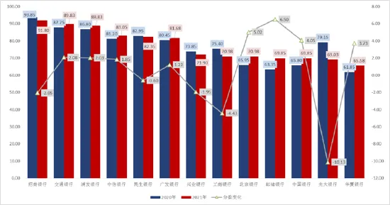 评测结果显示,2021年12家银行信用卡App平均分为77.36分(满分100分),其中,招商银行掌上生活得分超过90分,交通银行买单吧、浦发银行浦大喜奔、中信银行动卡空间、民生银行全民生活、广发银行发现精彩的得分也高于平均分。