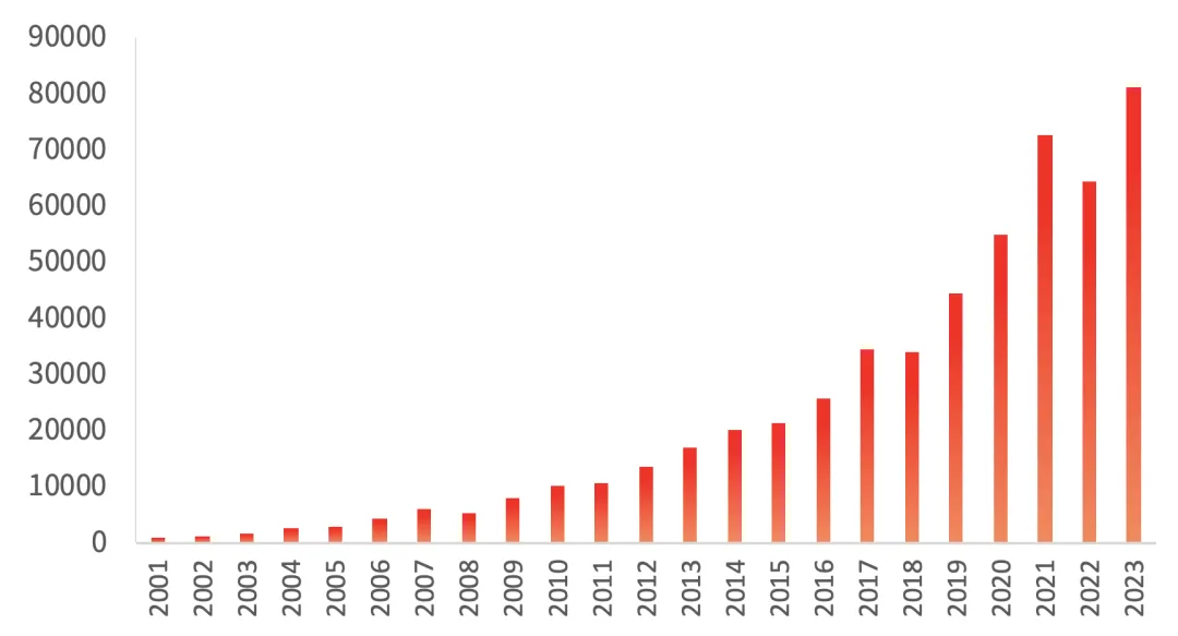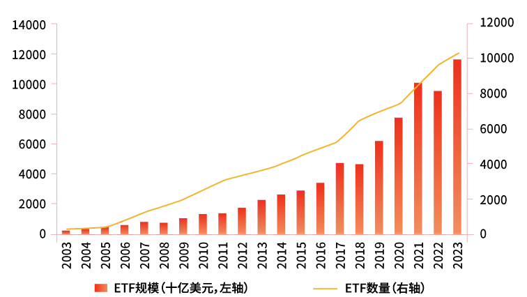 截至2023年底,全球挂牌交易的ETF资产总规模达到11.61万亿美元,较2022年底增加21.83%。近20年的规模年均复合增长率达到22.16%,产品数量更是连续20年保持正增长。