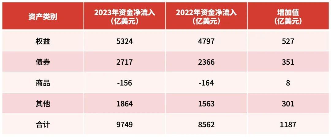 2023年,全球ETF行业资金大幅净流入,达到9749亿美元,相较于2022年的8562亿美元增加13.86%。分资产类别来看,权益ETF资金净流入最高,达到5324亿美元;债券ETF资金净流入达到2717亿美元;商品ETF资金净流出156亿美元;其他ETF资金净流入1864亿美元。