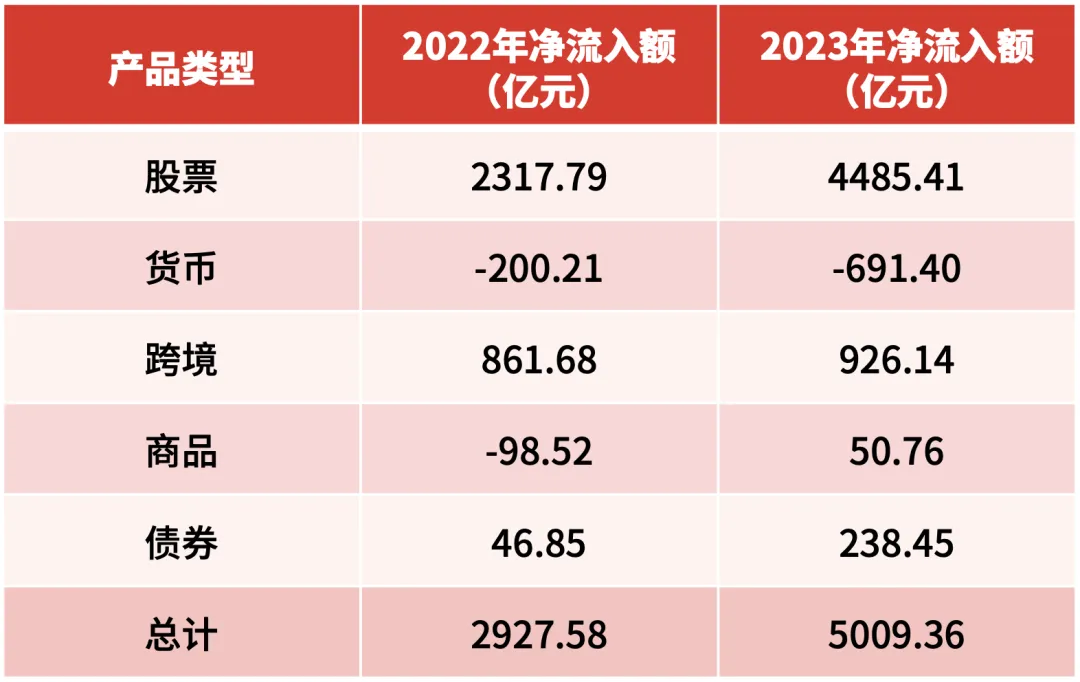 2023年境内ETF市场资金净流入创历史新高,全年净流入高达5009.36亿元,较2022年(2927.58亿元)增长71.11%,充分发挥了稳定市场的作用。分类型来看,股票ETF净流入最高,达4485.41亿元。除此之外跨境ETF净流入926.14亿元、债券ETF净流入238.45亿元、商品ETF净流入50.76亿元、货币ETF净流出691.40亿元。
