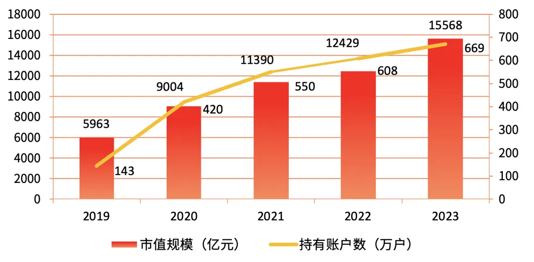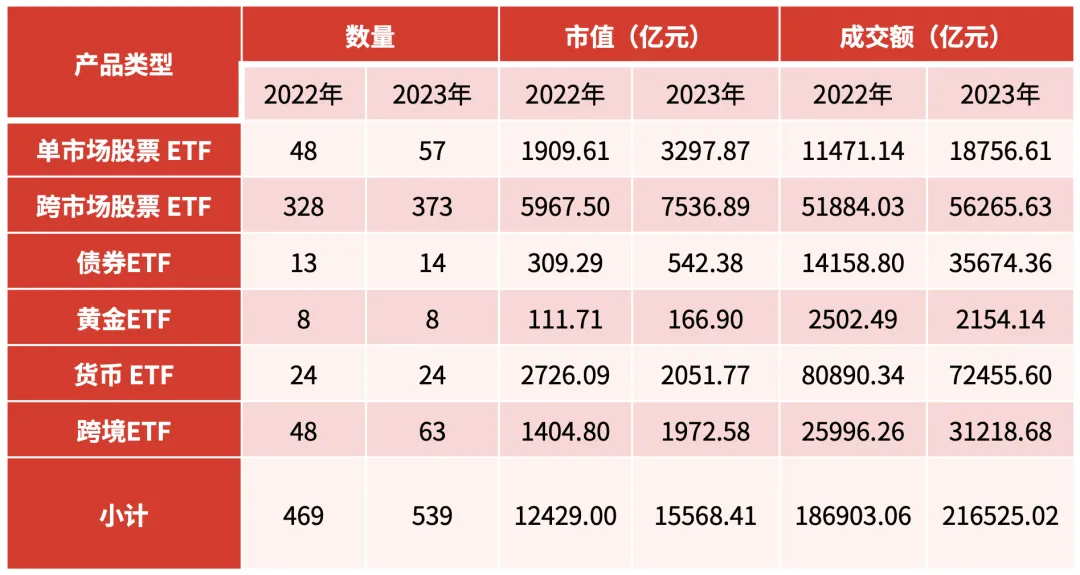 截至2023年底,沪市共挂牌ETF 539只,规模合计15568亿元,较2022年底增长25.26 %;全年成交额21.65万亿元,同比增长15.84%,沪市ETF成交额、规模分别位居亚洲第一、第二。与此同时,沪市ETF市场参与度也保持稳步增长,年末持有账户数669万户,同比增长10.05%,近五年年均增长率36.13%;全年交易账户数862万户,总体上投资者的ETF持有意愿有所增强。