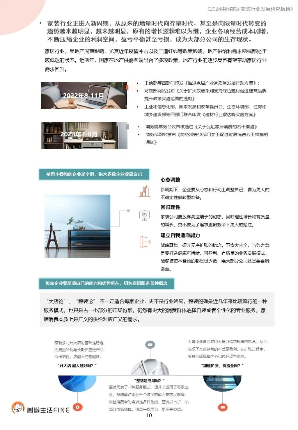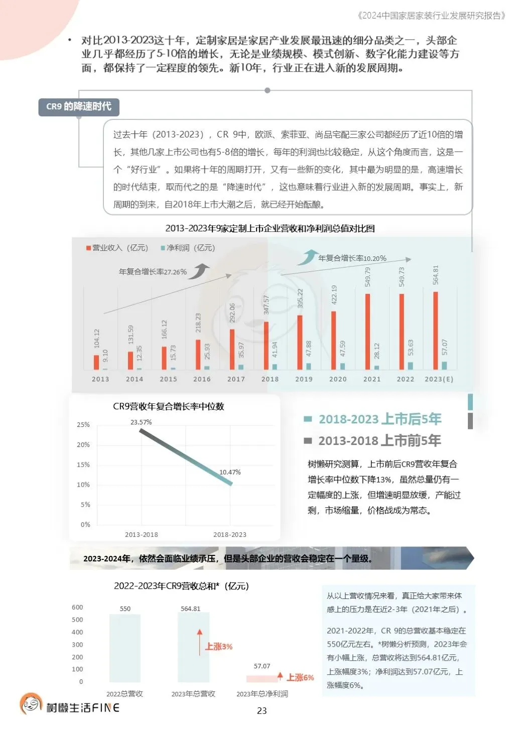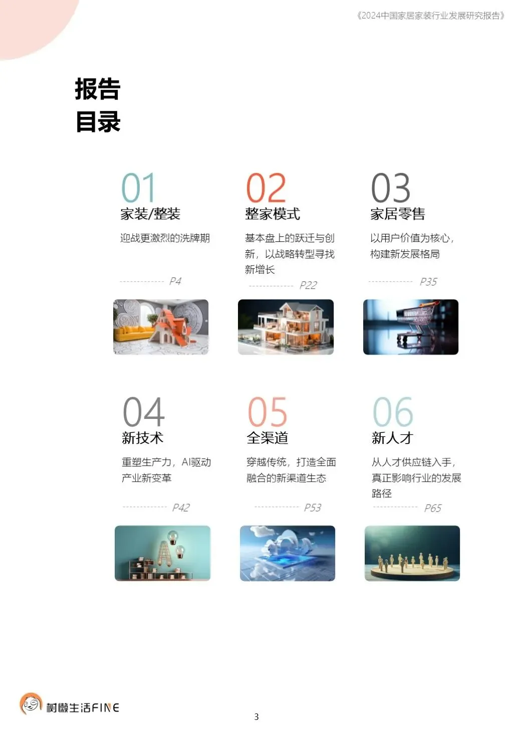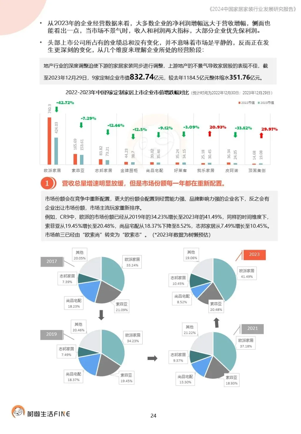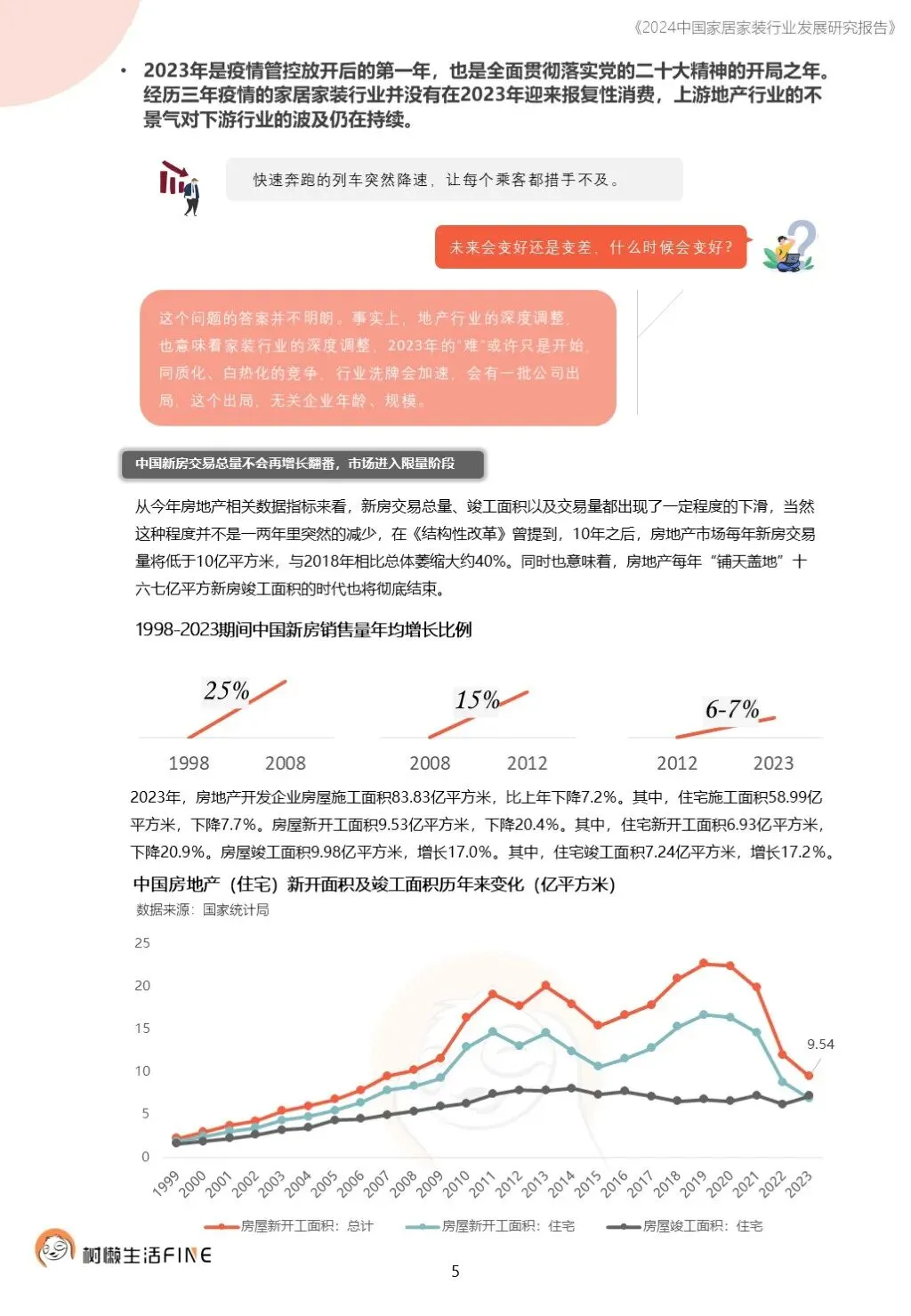 不知不觉已经踏入了2024年。过去这一年,每个人在波涛汹涌的大海中乘风破浪,勇往直前,非常不易。这一年,每个人都见证了太多行业发展的潮起潮落,资本并购、企业跑路、倒闭;这一年,增长压力之下,头部企业不断进行战略转型,寻找新的增长动力;这一年,新渠道、新技术、新人才,正在成为重构行业的新变量。新的一年,行业仍然存在很多挑战和不确定性,前行的路还有很多困难需要克服。产能过剩,需求萎缩的环境下,更激烈的竞争会是未来的常态,每家企业要为此做充足的准备,无论是乐观还是悲观,都要继续前行。这几年,行业各种概念太多,不但没有帮到企业,反而加剧了浮躁,渲染了焦虑。真正优秀的企业,一定是能够穿透纷繁复杂的概念,回归初心来寻找答案。2024年,务实和坚定应该要成为优秀企业的底色,尊重常识,多站在用户角度思考问题,重视基础,做不了基础工作的人也无力发起革新。树懒生活Fine撰写的这份《2024中国家居家装行业发展研究报告》如期而至。报告主要围绕家装/整装、整家模式、家居零售、渠道、技术、人才六个维度展开,期间与数十家公司通过面对面等多种方式进行访谈交流,体会经营者视角下的产业创新趋势。同时,从第三方公司的理性视角,用数据解读行业发展的现在和未来,希望对各位有所帮助,也欢迎更多的创业者与我们一起探讨交流。重为轻根,静为躁君。不管我们身处在一个什么样的时代,这是个体左右不了的,但是保持快乐、阳光、轻松、真诚、善良的心境和品德,这个取决于我们自己,或许这才是更好向前发展的基础前提。