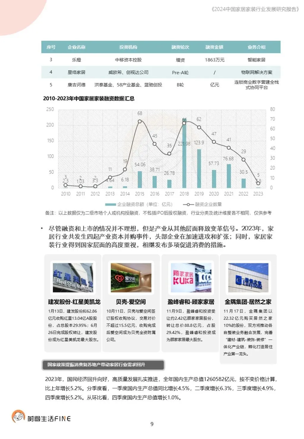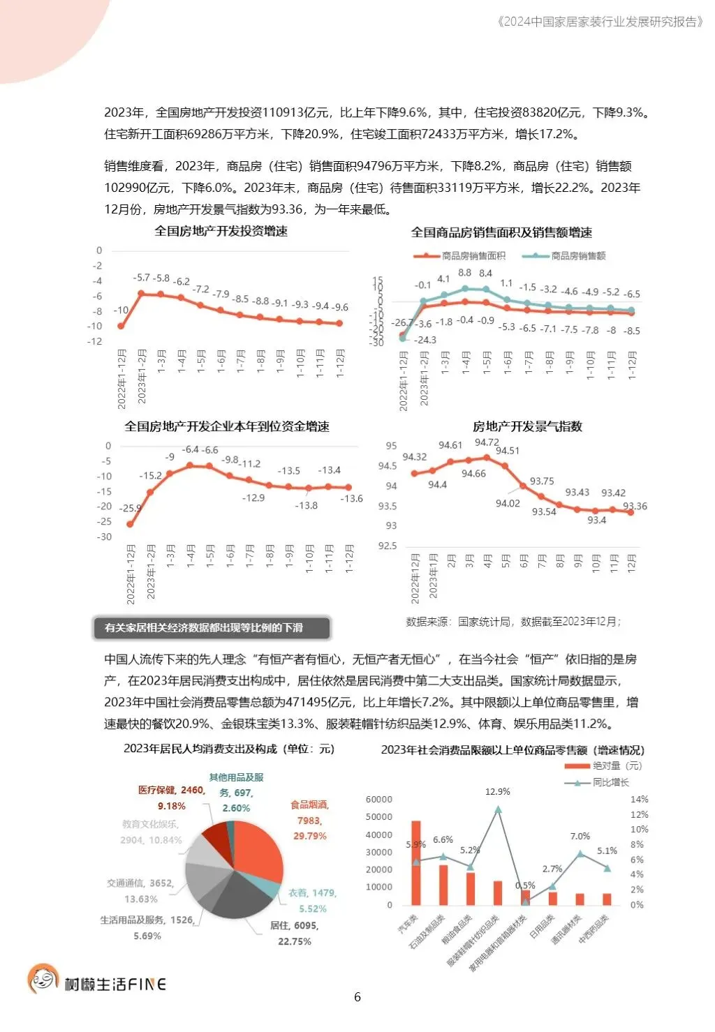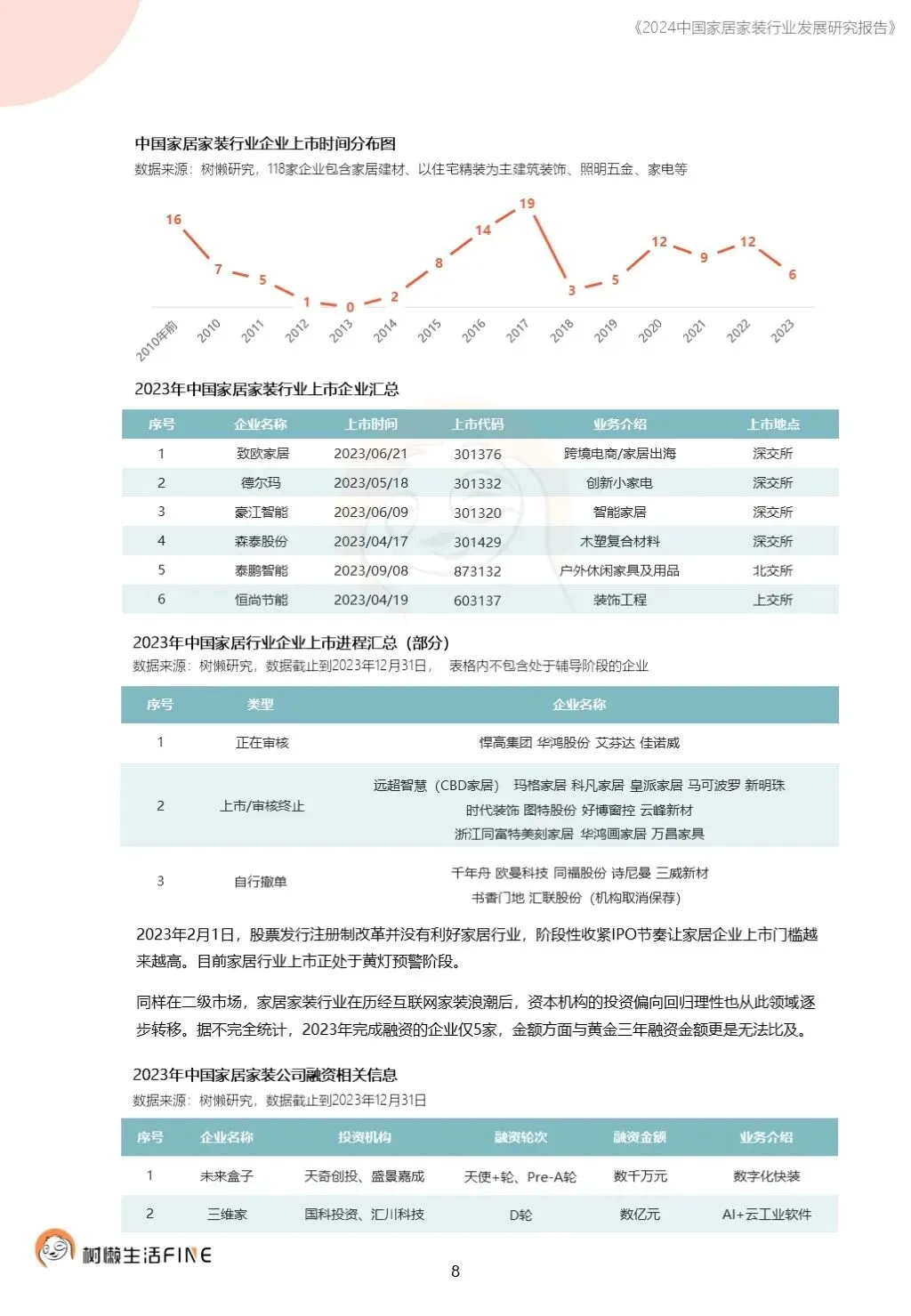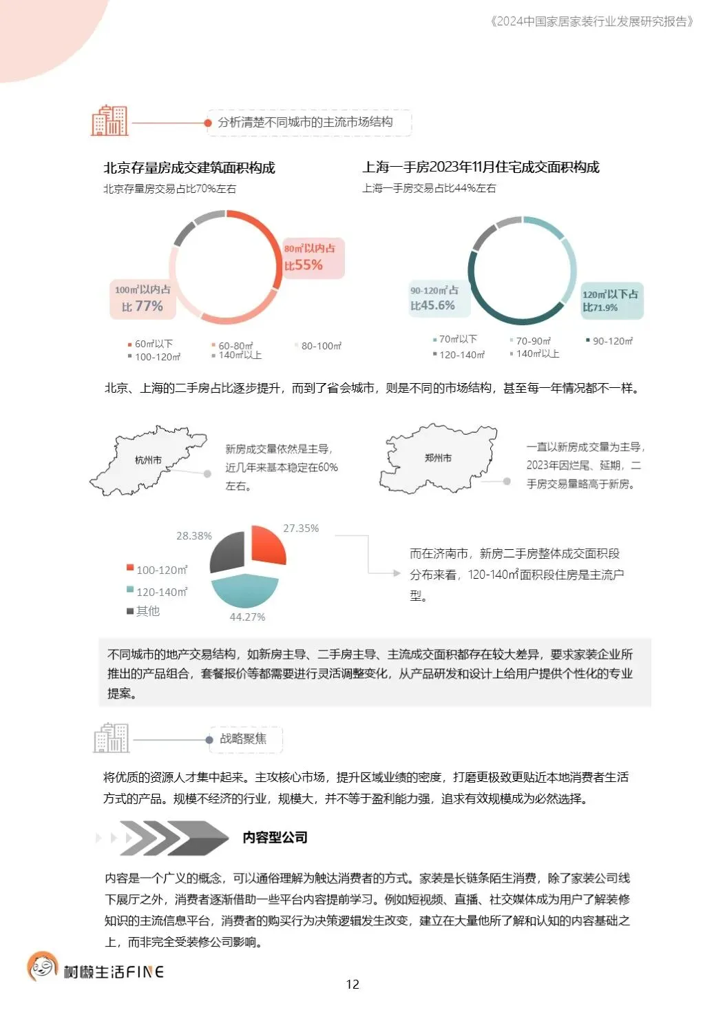 不知不觉已经踏入了2024年。过去这一年,每个人在波涛汹涌的大海中乘风破浪,勇往直前,非常不易。这一年,每个人都见证了太多行业发展的潮起潮落,资本并购、企业跑路、倒闭;这一年,增长压力之下,头部企业不断进行战略转型,寻找新的增长动力;这一年,新渠道、新技术、新人才,正在成为重构行业的新变量。新的一年,行业仍然存在很多挑战和不确定性,前行的路还有很多困难需要克服。产能过剩,需求萎缩的环境下,更激烈的竞争会是未来的常态,每家企业要为此做充足的准备,无论是乐观还是悲观,都要继续前行。这几年,行业各种概念太多,不但没有帮到企业,反而加剧了浮躁,渲染了焦虑。真正优秀的企业,一定是能够穿透纷繁复杂的概念,回归初心来寻找答案。2024年,务实和坚定应该要成为优秀企业的底色,尊重常识,多站在用户角度思考问题,重视基础,做不了基础工作的人也无力发起革新。树懒生活Fine撰写的这份《2024中国家居家装行业发展研究报告》如期而至。报告主要围绕家装/整装、整家模式、家居零售、渠道、技术、人才六个维度展开,期间与数十家公司通过面对面等多种方式进行访谈交流,体会经营者视角下的产业创新趋势。同时,从第三方公司的理性视角,用数据解读行业发展的现在和未来,希望对各位有所帮助,也欢迎更多的创业者与我们一起探讨交流。重为轻根,静为躁君。不管我们身处在一个什么样的时代,这是个体左右不了的,但是保持快乐、阳光、轻松、真诚、善良的心境和品德,这个取决于我们自己,或许这才是更好向前发展的基础前提。