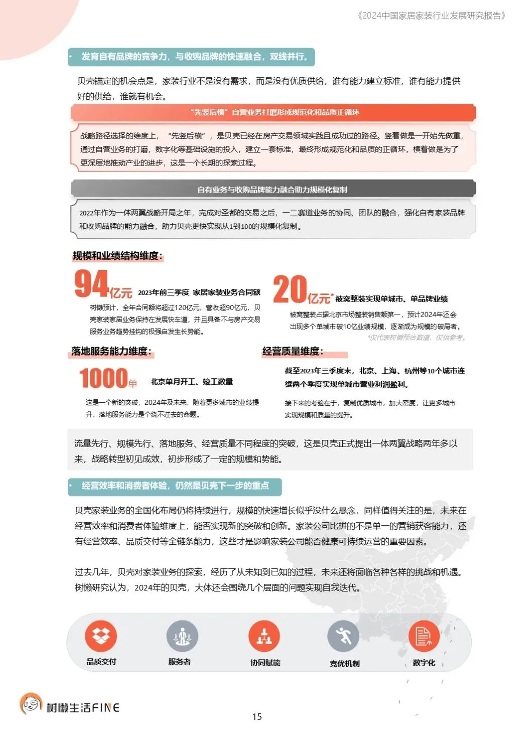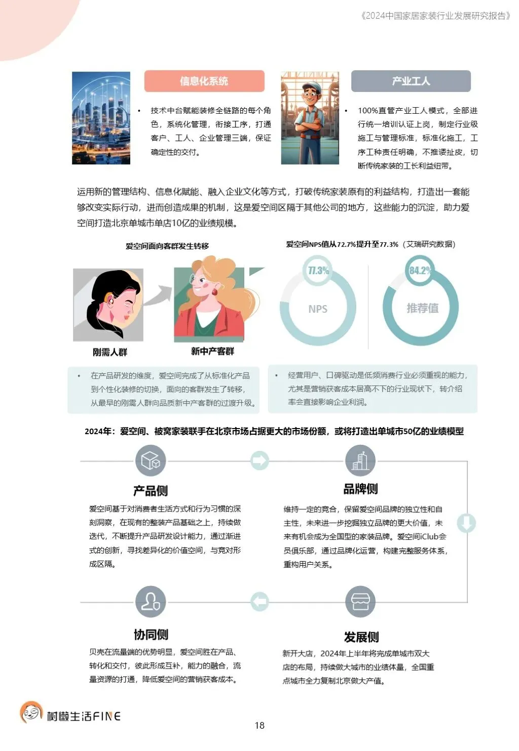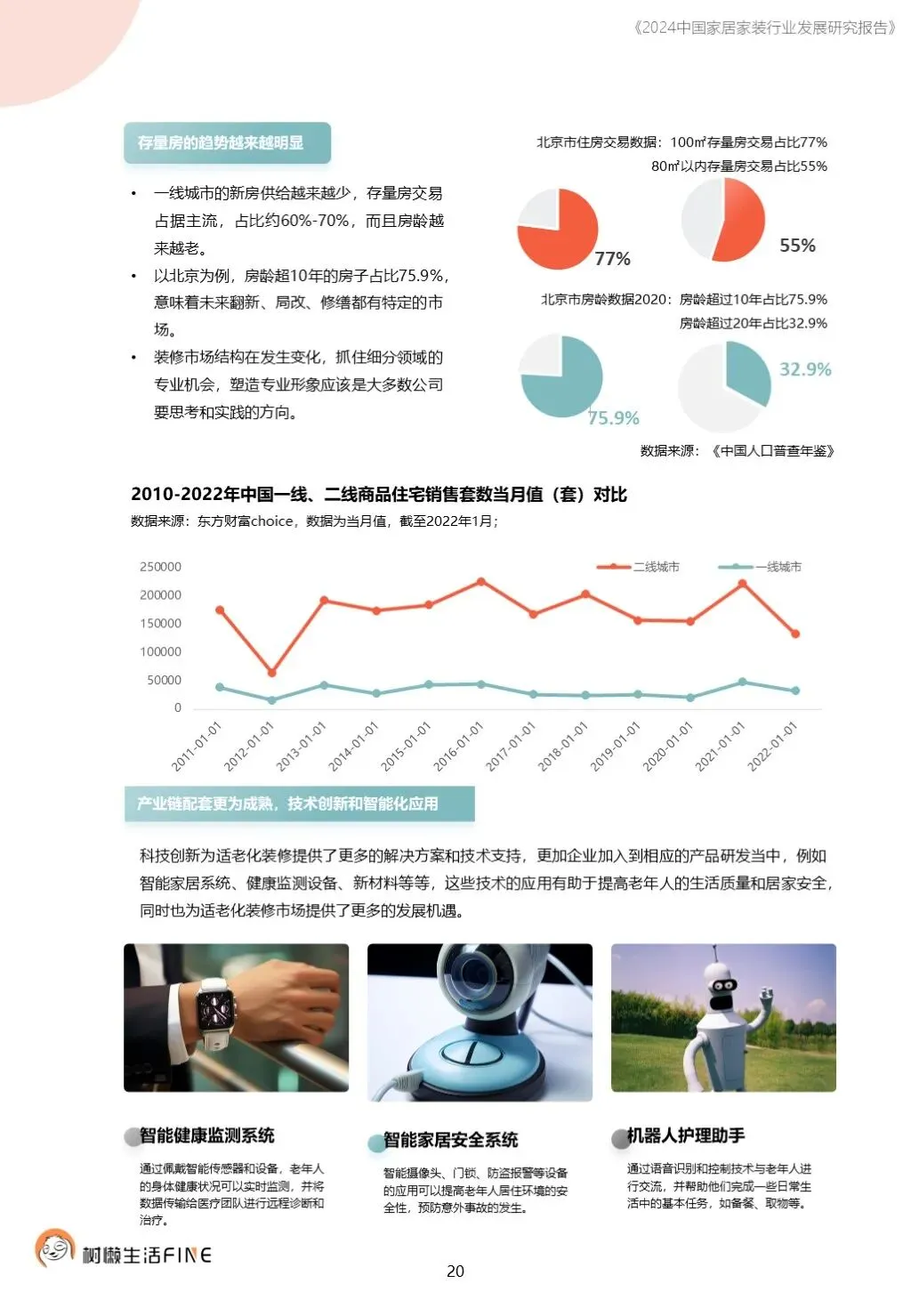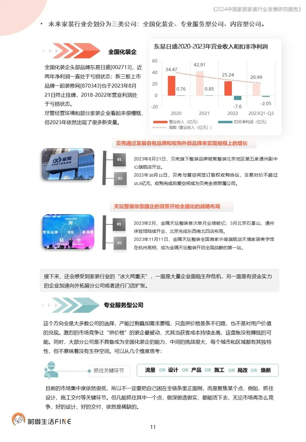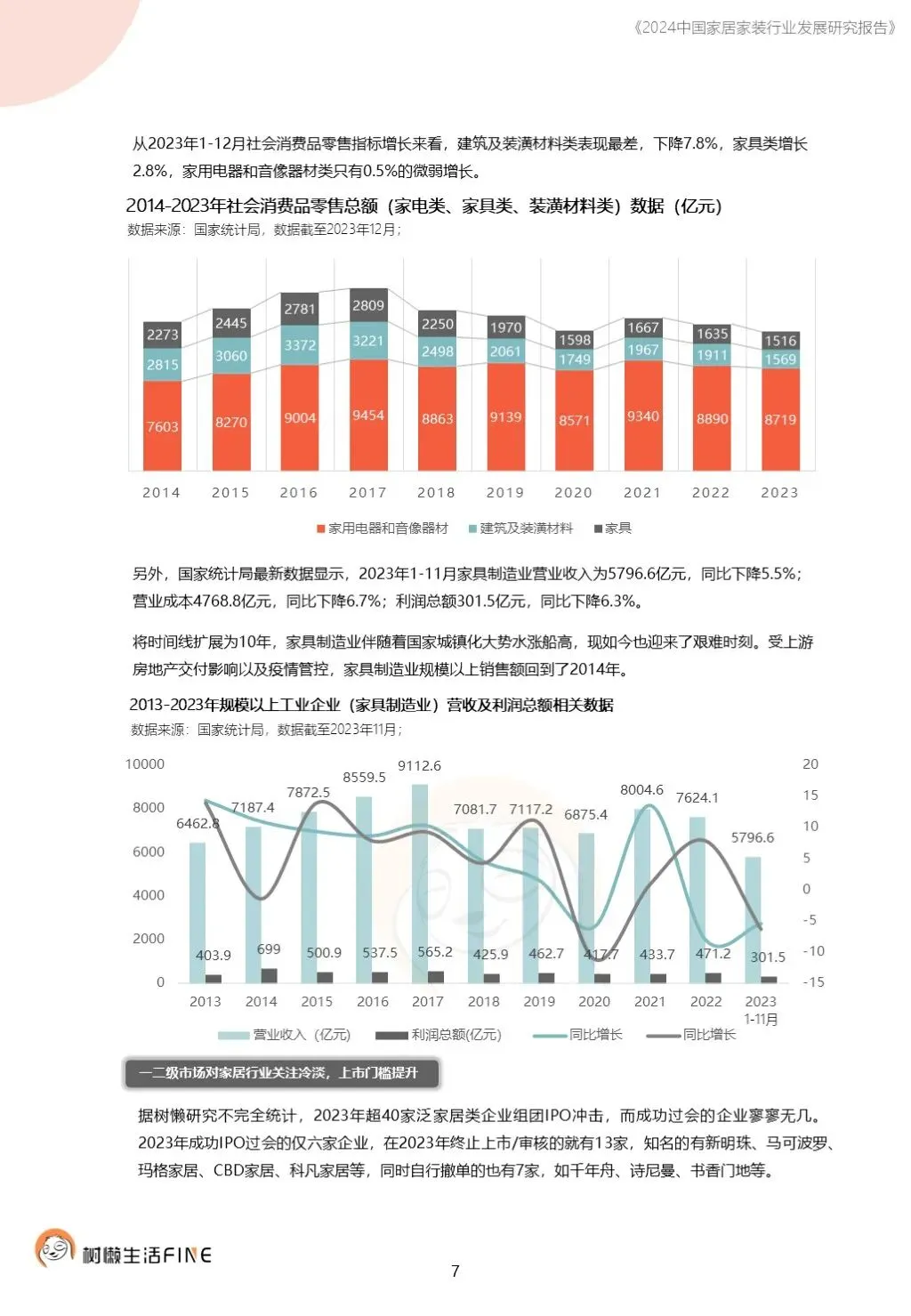 不知不觉已经踏入了2024年。过去这一年,每个人在波涛汹涌的大海中乘风破浪,勇往直前,非常不易。这一年,每个人都见证了太多行业发展的潮起潮落,资本并购、企业跑路、倒闭;这一年,增长压力之下,头部企业不断进行战略转型,寻找新的增长动力;这一年,新渠道、新技术、新人才,正在成为重构行业的新变量。新的一年,行业仍然存在很多挑战和不确定性,前行的路还有很多困难需要克服。产能过剩,需求萎缩的环境下,更激烈的竞争会是未来的常态,每家企业要为此做充足的准备,无论是乐观还是悲观,都要继续前行。这几年,行业各种概念太多,不但没有帮到企业,反而加剧了浮躁,渲染了焦虑。真正优秀的企业,一定是能够穿透纷繁复杂的概念,回归初心来寻找答案。2024年,务实和坚定应该要成为优秀企业的底色,尊重常识,多站在用户角度思考问题,重视基础,做不了基础工作的人也无力发起革新。树懒生活Fine撰写的这份《2024中国家居家装行业发展研究报告》如期而至。报告主要围绕家装/整装、整家模式、家居零售、渠道、技术、人才六个维度展开,期间与数十家公司通过面对面等多种方式进行访谈交流,体会经营者视角下的产业创新趋势。同时,从第三方公司的理性视角,用数据解读行业发展的现在和未来,希望对各位有所帮助,也欢迎更多的创业者与我们一起探讨交流。重为轻根,静为躁君。不管我们身处在一个什么样的时代,这是个体左右不了的,但是保持快乐、阳光、轻松、真诚、善良的心境和品德,这个取决于我们自己,或许这才是更好向前发展的基础前提。