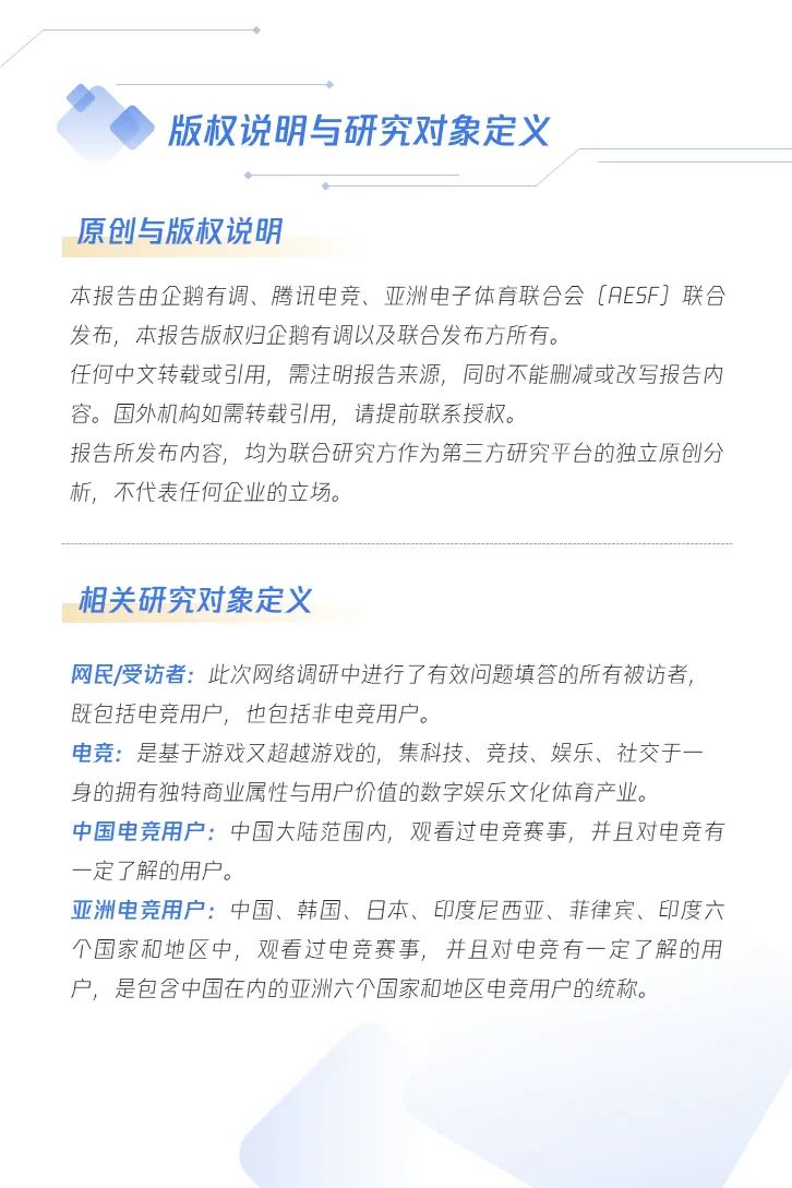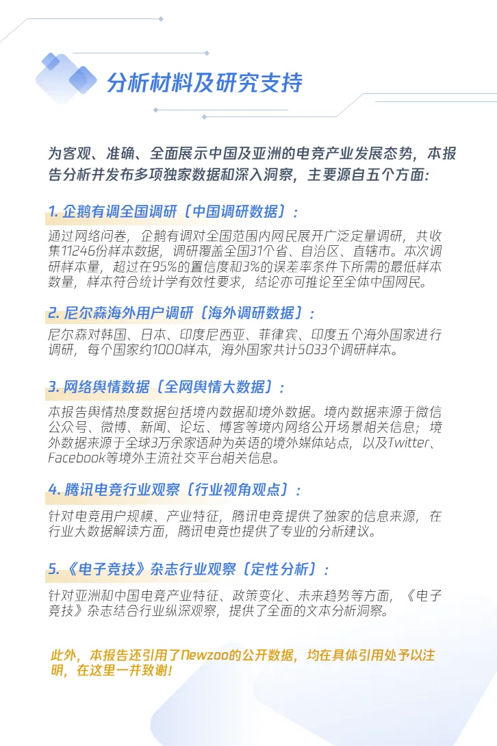 此次企鹅有调联合腾讯电竞、亚洲电子体育联合会(AESF),提前协同部署,重新整合研究资源,综合运用用户调研、舆情洞察、专家访谈等多重定量定性研究方法,最终共同完成了这份《2022年亚洲电竞运动行业发展报告》。