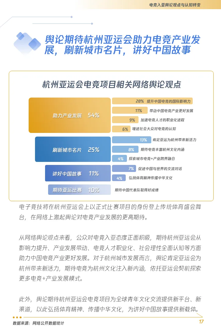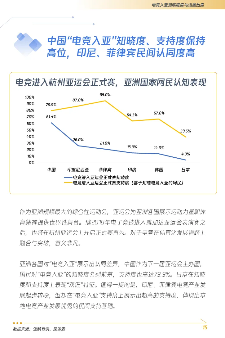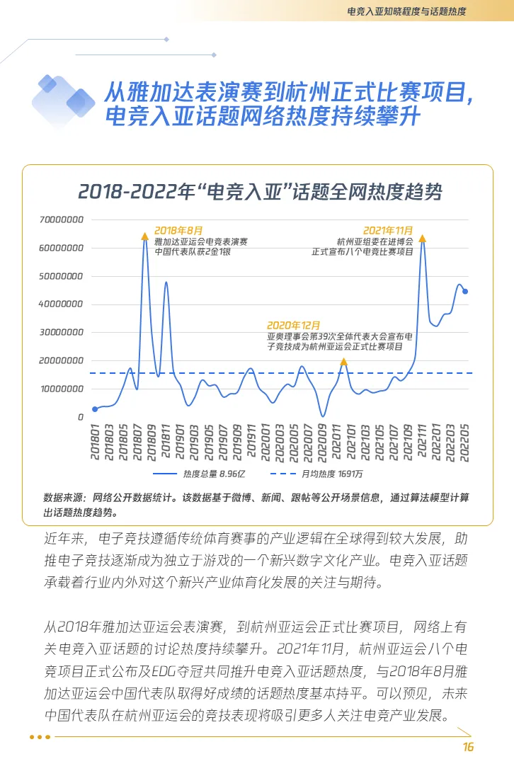 1. “电竞入亚”话题推高亚洲国家民众知晓度,增强了电子竞技的社会认同。借由亚运会的筹备,中国电子竞技正在持续进行一场规范化的深刻迭代,在体育发展路径上由虚向实、从松散走向规制。