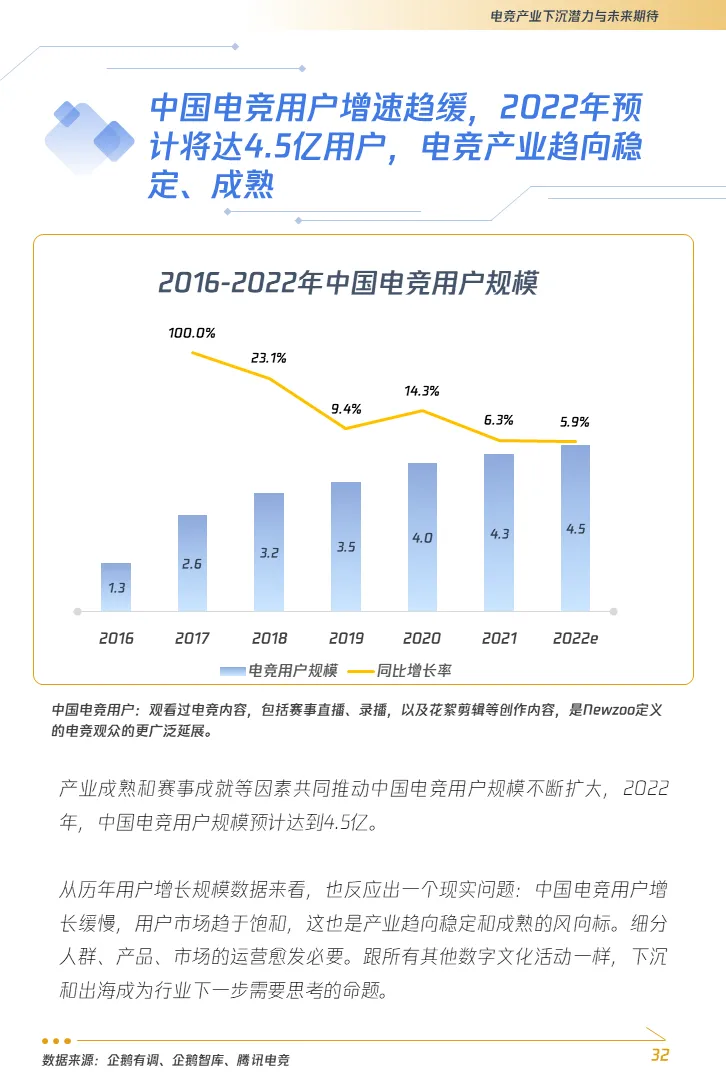 放眼亚洲,不同区域的电竞市场差异化显著,而中国电竞发展相对均衡,与韩国同处亚洲领先地位。2022年,中国电竞用户预计达到4.5亿。相较于印尼、印度等在全球后疫情时代用户迅速增长的亚洲电竞市场,中国电竞用户增速趋缓,电竞产业趋向稳定、成熟。