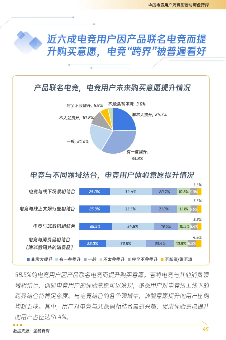 3. 电竞产业多元融合发展潜能不断释放,推动新经济新消费前景可观。电子竞技赛事正逐步摆脱游戏市场行为,以丰富的线上线下场景为依托,给观众提供了更好、更丰富的消费服务体验。