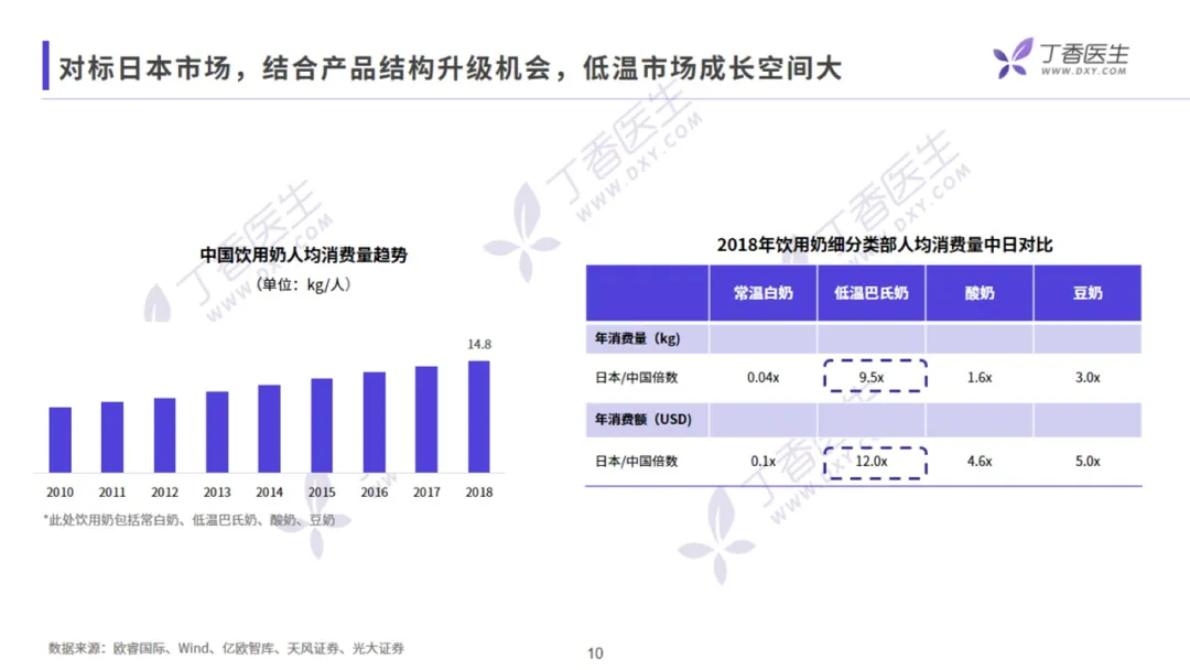历经多年发展,乳制品市场在 2015 年进入了品类变革期,呈现出四大变革点。第一是市场变革,伴随冷链技术的提升和产品分销渠道的开拓,低温市场的热度明显上升;第二是健康变革,大众的健康意识大幅提升,健康化发展成为大势所趋;第三是品类变革,更多的进口品牌进入中国市场,过去老化的产品逐渐被淘汰,植物基奶等新品类为市场注入新的活力;第四是渠道变革,新零售渠道蓬勃发展,推动了乳制品整体格局的变化。根据外部公开数据显示,2019 年中国乳制品消费市场规模达到了 4196 亿元,2010-2019 年年均复合增长率达 8.6%。从乳制品消费结构和用户购买类别来看,目前常温乳制品占据主要市场,低温乳制品规模比较有限,酸奶和液态奶各分天下。但是对标日本市场,结合产品结构升级机会,常温乳品未来增长潜力有限。低温乳品虽然受到冷链的限制导致整体规模有限,但市场成长空间巨大。