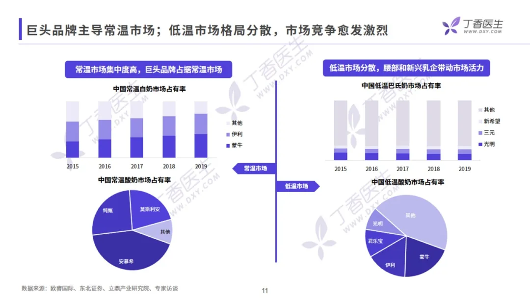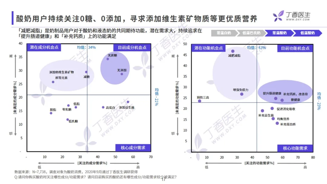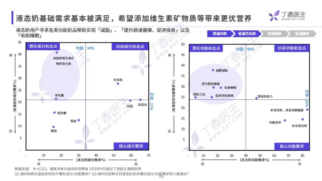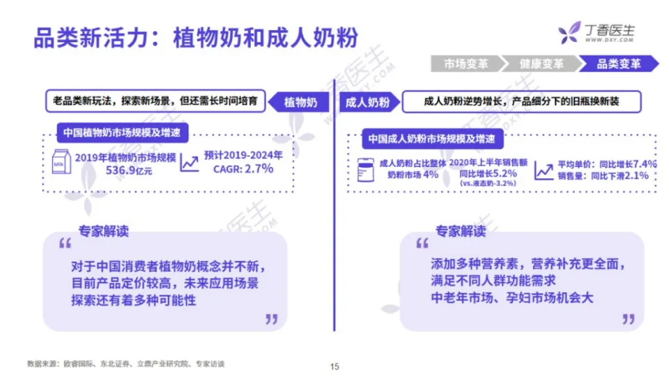 常温乳品市场内,品牌集中度较高。在常温白奶领域,伊利、蒙牛巨头制霸,占据难以撼动的位置。低温奶市场格局则较为分散,市场竞争激烈。伴随持续的技术创新和产品研发升级,乳制品市场整体呈现向高品质、好营养、强功能发展的趋势。首先是乳制品营养成分的不断优化,诸如 0 糖、0 添加、0 乳糖、低脂脱脂、高蛋白、高钙等各种维生素矿物质的添加,帮助满足大健康的需求;其次,目前酸奶市场各乳企都在积极引进菌种,细化功能需求,研发自有菌种。菌种的研发升级满足了各种消费者多样的功能性需要;另外,「超巴氏技术」、「膜过滤技术」使得低温巴氏奶能够保留更多活性成分,令其口感更优、营养更好,推动整个低温巴氏奶行业的升级。在液态奶领域,常温白奶增长放缓,未来需依靠高价带动。低温巴氏奶虽然整体规模小,但已进入快速增长期。营养成分如高蛋白、高钙、维生素矿物质等不断升级,优质营养需求驱动着品类量价齐升,整体呈现高端化趋势。据用户调研显示,目前液态奶的基础需求基本已被满足,未来用户希望通过添加维生素矿物质带来更优营养,并期望实现减脂、提升肠道健康促进吸收、助睡眠等需求。酸奶市场中,常温酸奶的营养创新点有限,市场增量不多,依靠口味创新向饮品和甜品化发展。而低温酸奶不仅以功能性、0 糖 0 添加、菌种升级满足大众的健康需求,还打破了固有食用场景,逐渐向餐后、休闲、代餐等多元场景拓展。总体来看,低温酸奶的未来市场增长空间较大。酸奶用户持续关注 0 糖 0 添加,寻求添加维生素矿物质等更优质营养。但不论是酸奶还是液态奶,用户都怀着「减肥减脂」的共同期待,并持续追求在「提升肠道健康」、「补充钙质」上的功能满足。近年来,植物基奶异军突起,吸引了越来越多年轻人的关注。它的崛起一方面得益于国外环保主义者、素食主义者对植物性饮食运动风潮的推动;另一方面,它也为乳糖不耐受人群、牛奶蛋白过敏人群、素食主义者提供了优质替代品,在体重管理、健身、改善肠道功能需求等场景有较多应用。专家表示:植物奶概念并不新鲜,技术上也不算成熟,其未来市场发展还需要长时间的培训。另一方面,受城镇化人口红利和消费升级的驱动,2020 年上半年中国成人奶粉市场销售额同比呈增长趋势。相较于液态奶,奶粉可以添加多种营养素以满足不同人群的健康需求和功能需求,其中迎合老龄化趋势的中老年奶粉和满足孕妇需求的孕妇奶粉皆在营养补充上做得较为全面,未来市场潜力巨大。