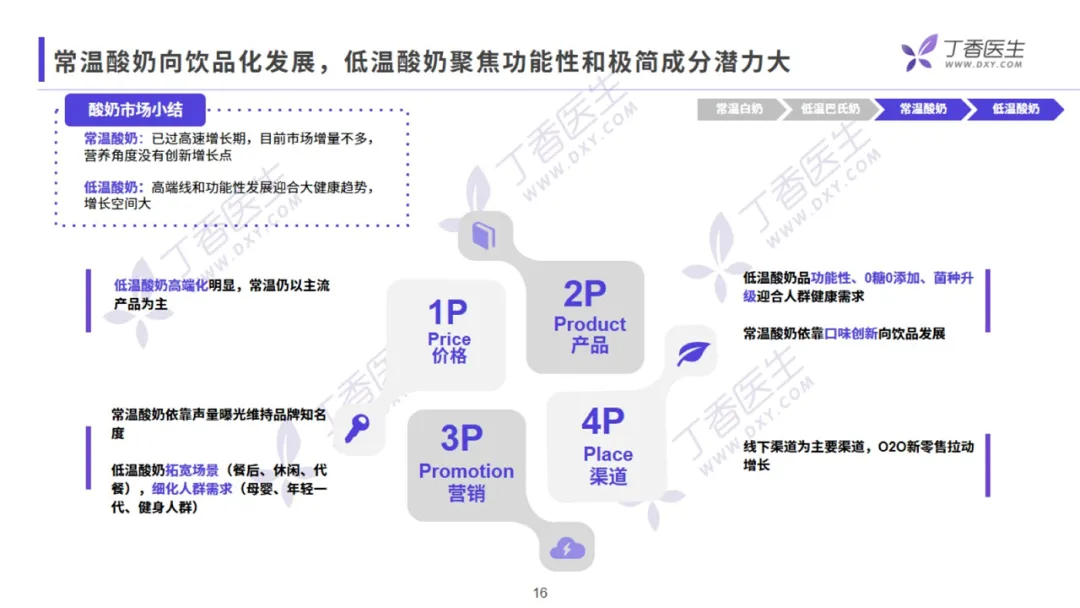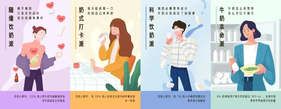 在品牌自有渠道的传播中,也充分应用丁香医生知识赋能的权益,提升了产品传播效率。线下销售端,丁香医生 IP 联合活润在线下渠道以多种物料呈现,凸显产品利益点,强势种草,实现事半功倍的销售效果。而在液态奶品类中,丁香医生与蒙牛纯牛奶也有过合作。丁香医生联手蒙牛发起《牛奶饮用习惯调查》,从常见的饮奶问题入手,激发用户较强关注度和代入感。针对收到的 25000+ 份反馈,丁香医生深度分析用户的饮奶习惯和需求,剖析常见的饮奶误区,通过打造「随缘饮奶派」、「奶式打卡派」、「科学饮奶派」、「牛奶本命派」 4 个趣味标签,实现多场景沟通触点,输出正确的饮奶知识科普报告。报告作为品牌与用户的沟通介质,一方面强化了品牌认知和产品价值,另一方面激活了用户的品牌好感度和消费需求,最终获得品牌与用户的一致认可。此外,丁香医生还与雀巢怡养中老年奶粉合作过「中老年小课堂」主题专栏,输出关于血糖控制、阿尔兹海默症预防等老年人最关心的健康话题,并在其中植入产品信息,提升产品传播效率。