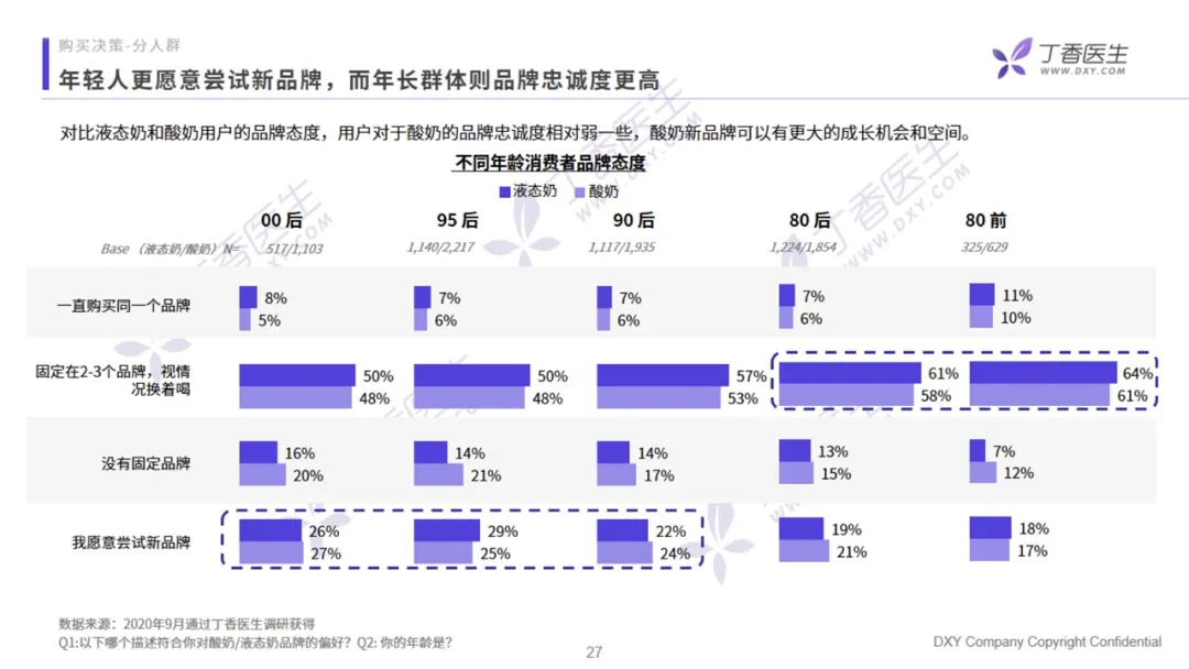 相较于主流媒体强曝光的营销形式,在当下产品和品牌选择丰富的市场里,通过科普和测评满足「博士级」用户的需求,从而实现品牌和产品的差异化也不失为新的选择。而在乳制品的科普话题当中,消费者最感兴趣的就是如何科学选奶、饮奶,其次分别是乳制品的成分科普和功能科普。在消费决策阶段,年长人群的品牌忠诚度更高,年轻人则更愿意尝新。新品牌从年轻群体切入,发展机会更大。