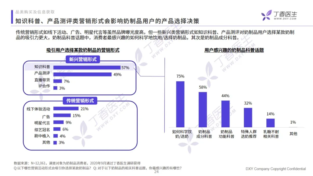 本次报告的用户数据征集来自 4323 名液态奶用户和 7738 名酸奶用户。数据显示,有过半乳制品用户做消费决策时,更容易受到知识科普、产品测评类的新兴营销形式的影响。