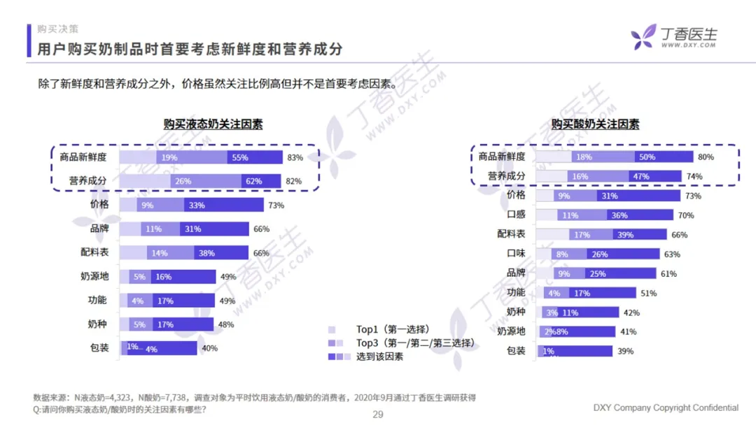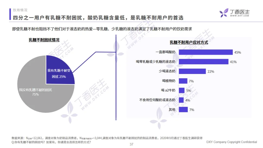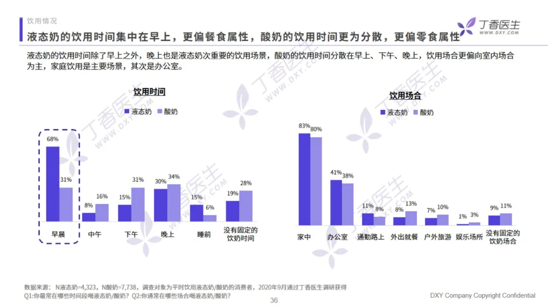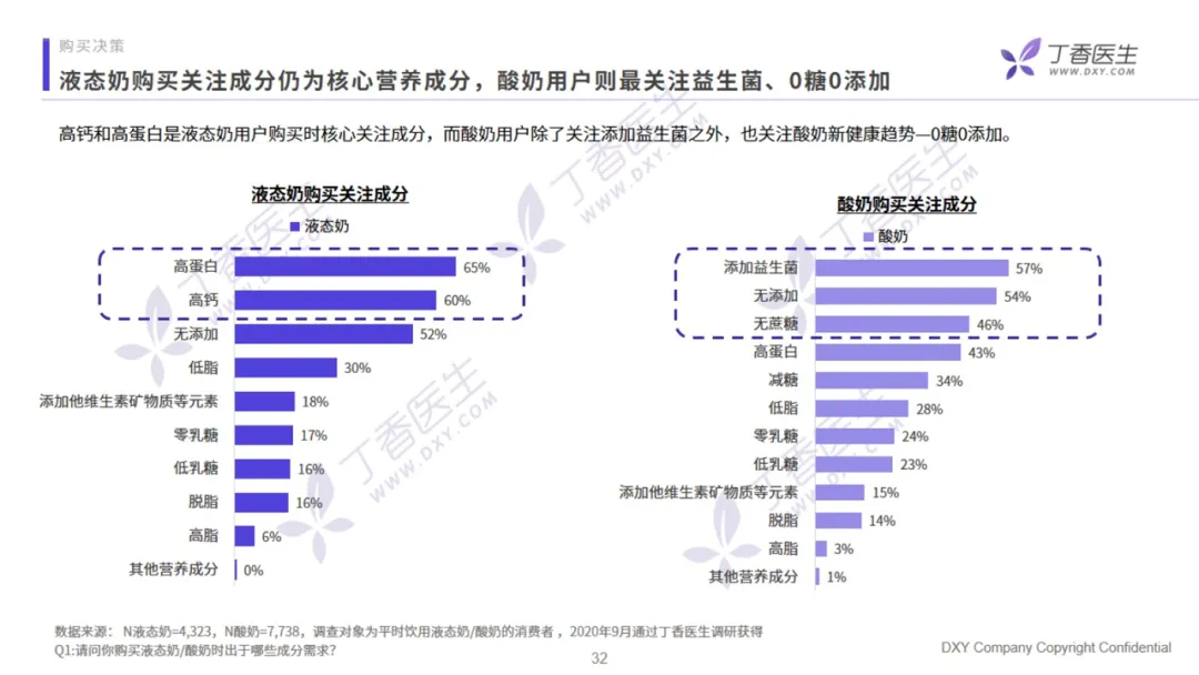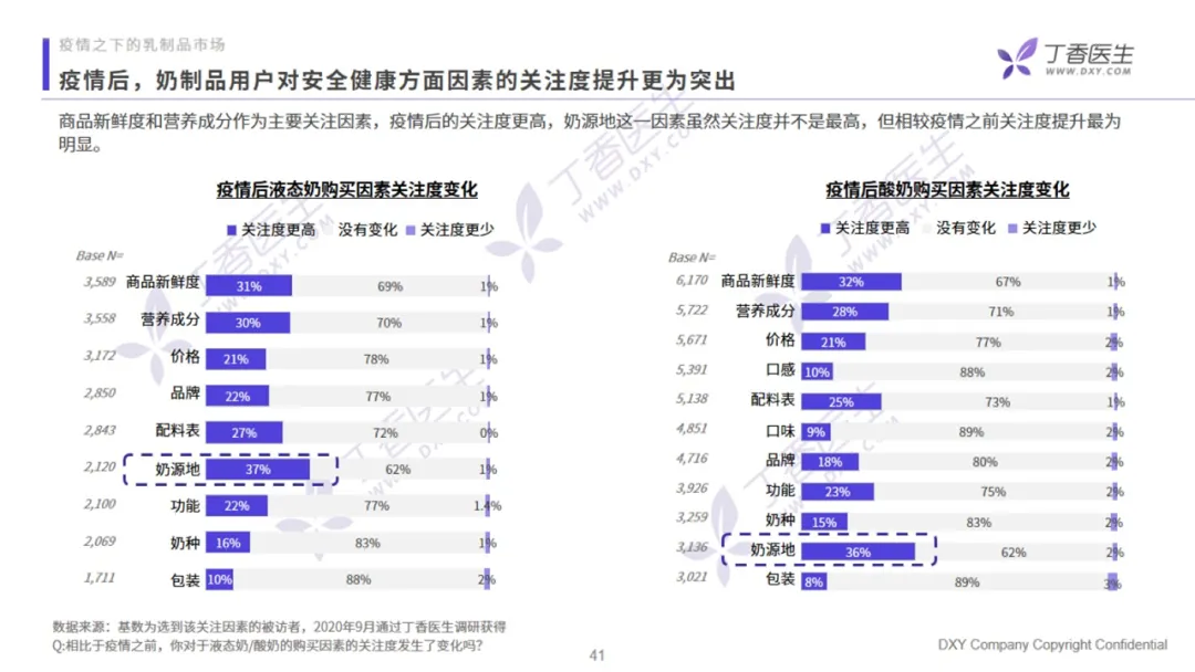 用户在购买乳制品时,无论是液态奶还是酸奶,都最看重产品的新鲜度和营养成分。价格虽然关注比例高,但不是用户的首要考虑因素。针对不同品类,用户的成分关注点也不同。高钙和高蛋白是液态奶用户最关注的核心成分,分别占比 65% 和 60%,而酸奶用户的关注成分前三位分别是添加益生菌、无添加、无蔗糖,完全符合全民健康的大趋势。从饮用情况来看,液态奶的饮用频率更集中。有 68% 的用户选择在早上饮奶,主要为日常补给型,餐食属性更强。酸奶的饮用时间则较为分散,早晨、下午和晚上三个时段的饮用占比均匀,零食属性更强。调研中,有 25% 的受访用户受乳糖不耐症的困扰,其中 45% 的用户选择一直喝酸奶,41%的用户喝零乳糖或是少乳糖的液态奶。在疫情之后,专家对乳制品补充营养的功能教育效果延续,用户对安全健康方面因素的关注度提升非常突出,其中以奶源地的关注度提升最为明显。