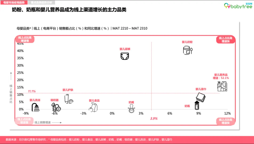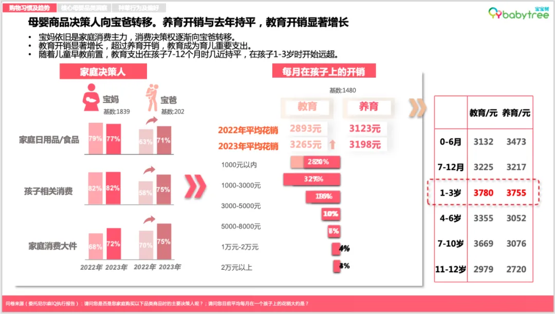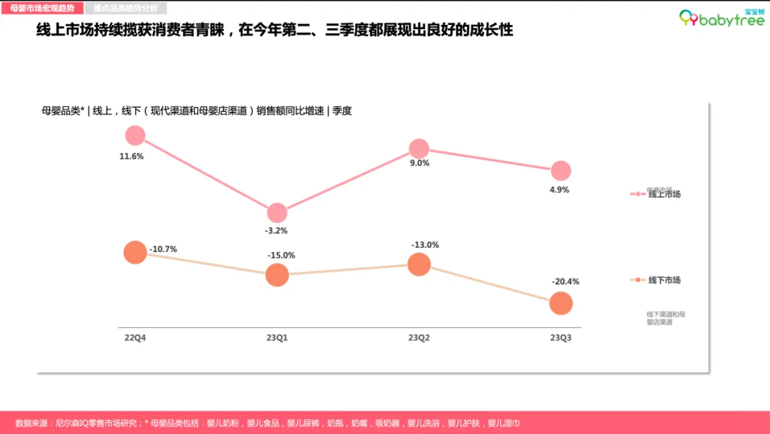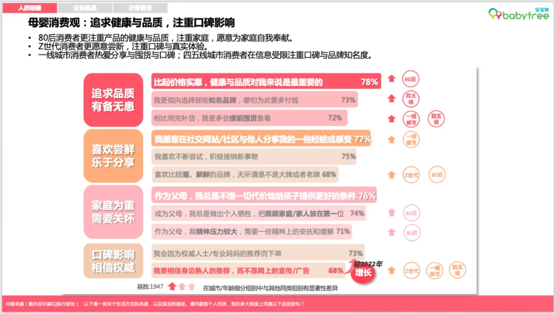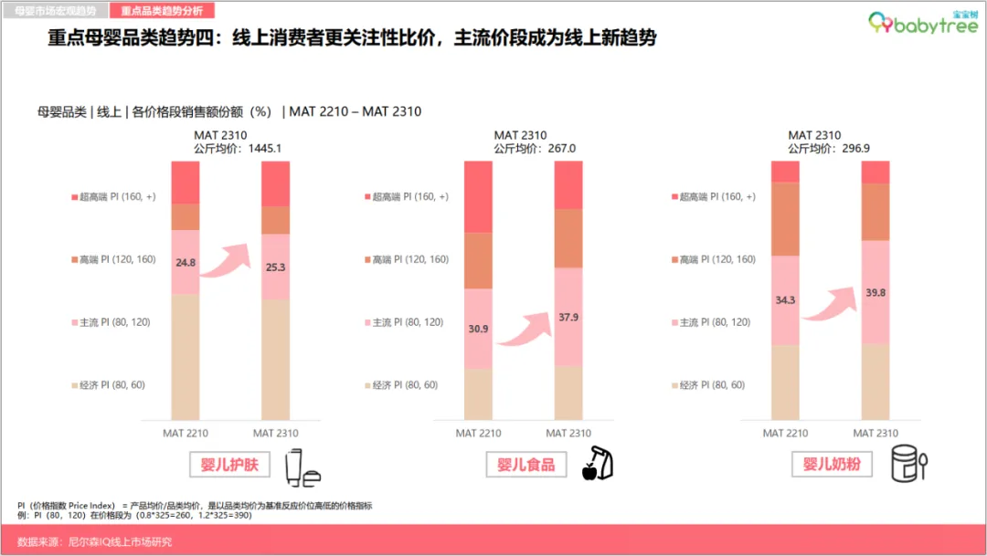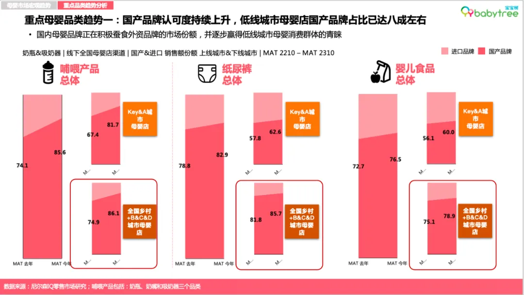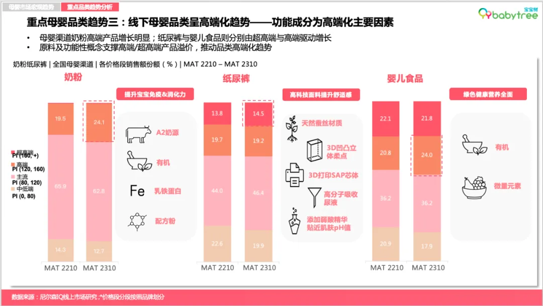 图:宝宝树X尼尔森IQ《2023母婴行业洞察报告》值得注意的是,母婴品类线上渠道占比也正进一步抢占线下现代渠道份额,其中奶粉、奶瓶和婴儿营养品为线上渠道增长主力品类,尤其以婴儿营养品品类最为显著。图:宝宝树X尼尔森IQ《2023母婴行业洞察报告》如今营养“第四餐”加速渗透全民生活,母婴人群亦成为消费主力军。报告数据显示,婴儿营养品在线上渠道占比持续扩大且保持高速增长,相较2022年同比增幅达52%。渠道方面, 抖音作为新兴渠道凭借强大渗透率与用户规模, 在该品类上实现了高速增长。趋势一:国货崛起正当时,低线城市母婴店国产品牌占比已达八成左右伴随95后、00后成为孕育主力,国潮崛起、国货升级已深入新一代母婴人群的消费理念。国内母婴品牌正在积极蚕食外资品牌的市场份额,并越发赢得低线城市母婴消费群体的青睐与认可,目前在低线城市母婴店的占比高达八成左右。其中,哺乳喂养类(包括奶瓶、奶嘴、吸奶器)产品的国产品牌在线下母婴店2023年份额同比增长超过15%,纸尿裤与婴儿食品的国产品牌在线下母婴店2023年销售份额则同比增长均超5%。图:宝宝树X尼尔森IQ《2023母婴行业洞察报告》趋势二:婴儿产品升级功能化专业化,免疫及消化型概念需求则连年上涨当下,精细化科学育儿成为大势所趋。新生代父母除了关注宝宝营养和安全之外,也更加注重宝宝感受体验,例如婴儿湿巾和奶嘴,消费者更加注重舒缓皮肤和真实感。面向不同月龄、不同场景、不同体质等更具针对性的消费者需求,婴儿产品的功能日趋细分化、专业化。调研显示,APG葡糖苷、甜菜碱、仿生胎脂等高新成分成为“成分党”宝爸宝妈们在选择婴儿洗护用品的心仪之选。与此同时,继有机概念后,免疫及消化型概念需求则连年上涨,其中益生菌、乳铁蛋白、A2等成分概念表现出强劲增长势头。究其背后原因,疫情后的连锁反应所带来的“免疫债”,或成为了扭转趋势的重要因素。图:宝宝树X尼尔森IQ《2023母婴行业洞察报告》趋势三:母婴产品高端化“卷入”人工智能赛道与颜值经济人口结构调整叠加技术浪潮革新,促使母婴产业加速转型升级,产品服务“卷”出新高端。时下,高端母婴产品不仅表现在功能成分的高端化,同时更加注重IP和颜值,并积极融合前沿AI人工智能技术。图:宝宝树X尼尔森IQ《2023母婴行业洞察报告》数据显示,母婴渠道主流品类高端化长势喜人,其中,奶粉高端产品同比增长23.6%,纸尿裤与婴儿食品则分别由超高端与高端驱动增长。原料及功能性概念支撑高端/超高端产品溢价,推动品类高端化趋势。与此同时,精致养娃新一代更加愿意为“颜值经济”买单。高端产品顺势开展各类IP联名,提升萌娃社交属性的同时进一步推动口碑破圈与销售拉升。另一边,伴随人工智能的快速发展,AI奶瓶、人工智能婴儿车、智能尿布等多样化的母婴智能产品如雨后春笋般层出不穷,母婴产品加速迈向智能化时代。趋势四:线上消费“性价比为王”,主流价段销售增长显著2023年,线上消费者更加关注产品的性价比,主流价段成为线上新趋势。数据显示,线上消费中,婴儿护肤、奶粉、婴儿食品等重点品类的主流价格带产品销售增长明显,其中每公斤的婴儿食品主流价段(213.6,320.4)的销售额同比增速达22.6%、奶粉主流价段(237.52,356.28)的销售额同比增速达16%。图:宝宝树X尼尔森IQ《2023母婴行业洞察报告》人口新形势下,中大童市场进入消费红利期。数据显示,2023年面向3-6岁以上中大童年龄段消费的四段奶粉销售额增幅仅次于一段奶粉,XXXL纸尿裤份额增长2.3%、销售增幅达40.5%。中大童向产品进一步在品类中获取份额,为母婴消费市场打开新蓝海。与此同时,新生儿所需的1段奶粉份额增长1.2%,NB+S纸尿裤份额增长2.7%,也为母婴市场释放出了一定积极信号。图:宝宝树X尼尔森IQ《2023母婴行业洞察报告》整体来看,Z世代(95后,00后)人群成为母婴主力军,占母婴人群总体42%,低线城市Z世代母婴人群占比相对更高。教育方面,新一代母婴人群普遍受教育程度较高, 多数拥有大学以上学历。消费方面,2023年母婴家庭平均月收入约2.1万元,相较去年2.2万元家庭平均月收入小幅降低。宝妈依旧是家庭消费主力,但令人欣喜的是,新生代宝爸在育儿消费中的参与度有所提升,母婴商品决策人向宝爸转移。当代母婴人群普遍追求做学习型家长,从备孕时期开始用知识武装自己,主要通过线上资料搜索、咨询医生、母婴平台交流增强知识储备。自然孕育是母婴消费者主流追求,超两成母婴人群考虑借助辅助生殖,其中60%母婴消费者能接受8万元内的辅助生育消费,陆续出台的辅助生育纳入医保政策受到关注。伴随政策的优化支持,多孩家庭占比逐年提升,2023年占比上升至15%。多胎的考量主要受限于时间和经济成本。其中,经济成本过高是80、90后不生多胎的原因,而Z世代主要担心多孩之间的矛盾。半数丁克人群属于非“铁丁”人群。经济补贴、增加可支配产假,以及加强对托育与家政行业的监管等有望改变/提升生育意愿。有孩家庭面临新的困扰,新生代父母普遍感受到“社会竞争”“生活压力”等内卷问题,62%的家长对孩子成长感到焦虑。因此,父母们一边更专注于“卷”自己,希望为孩子提供更好的教育环境、更富足的吃穿用度。同时,开启“鸡娃”模式,家庭教育开销大幅增长,占家庭总支出平均占