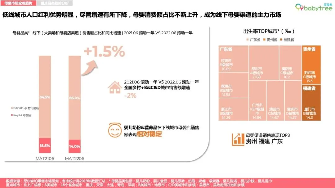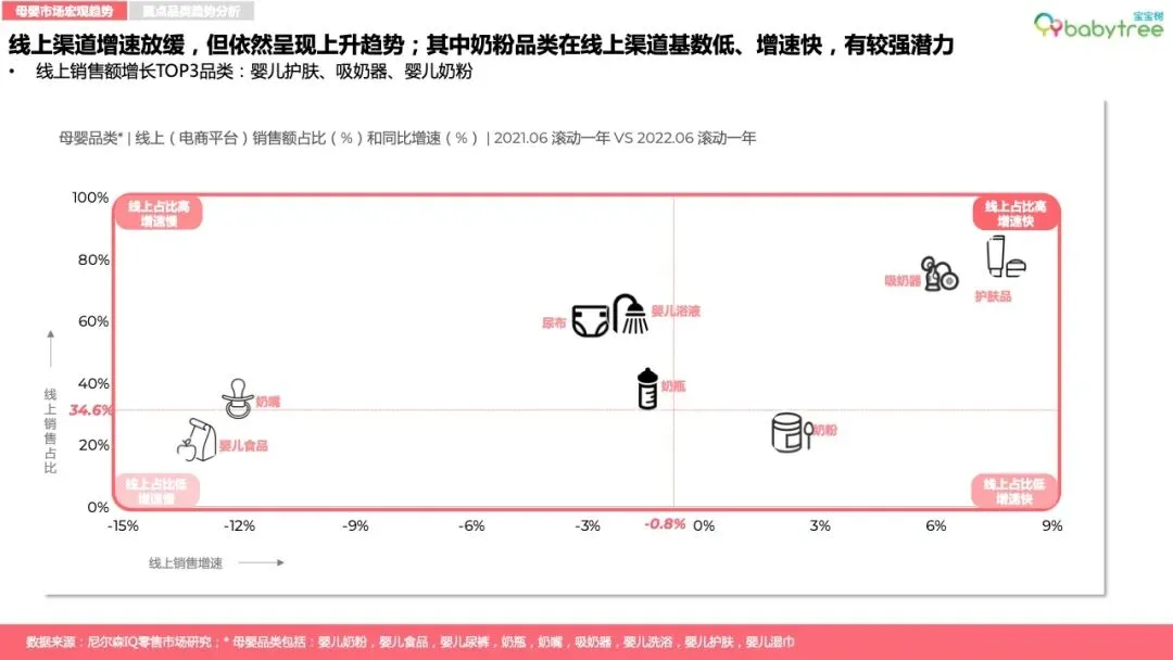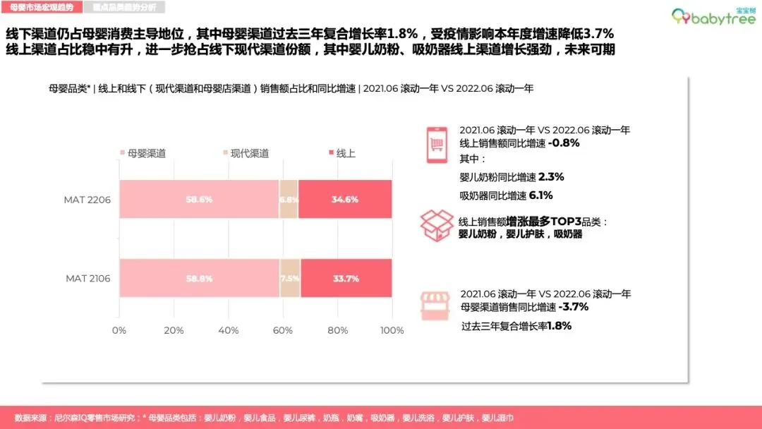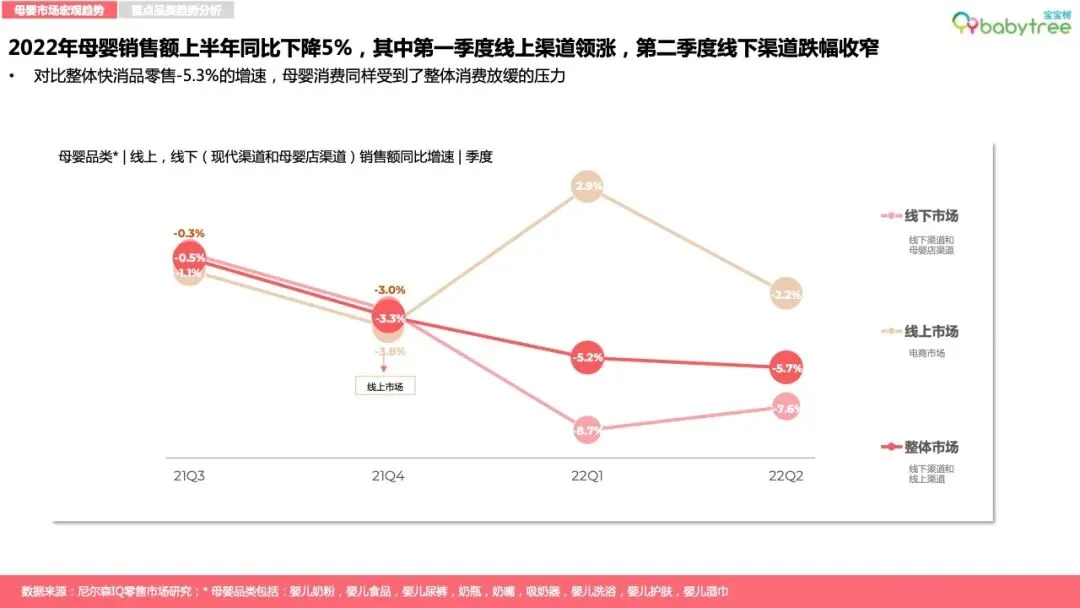 2022年上半年,整体快消品零售市场增速放缓,母婴销售额同比下降5%。2022年一季度母婴消费线上渠道领涨,二季度线下渠道回暖。