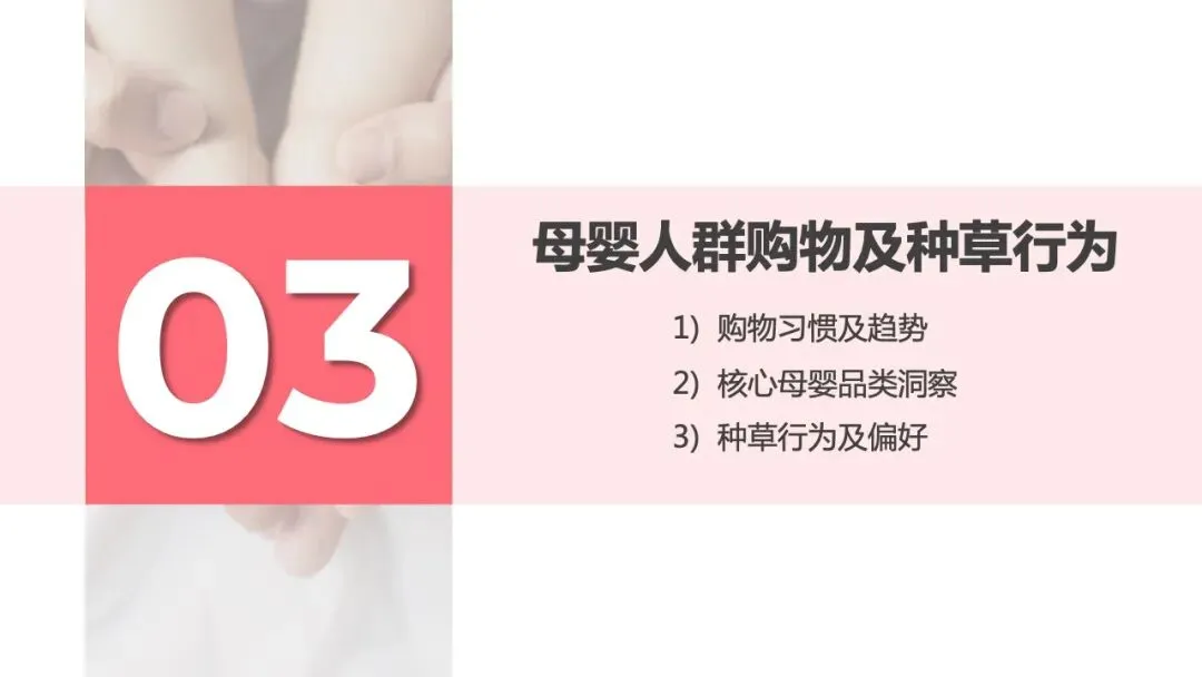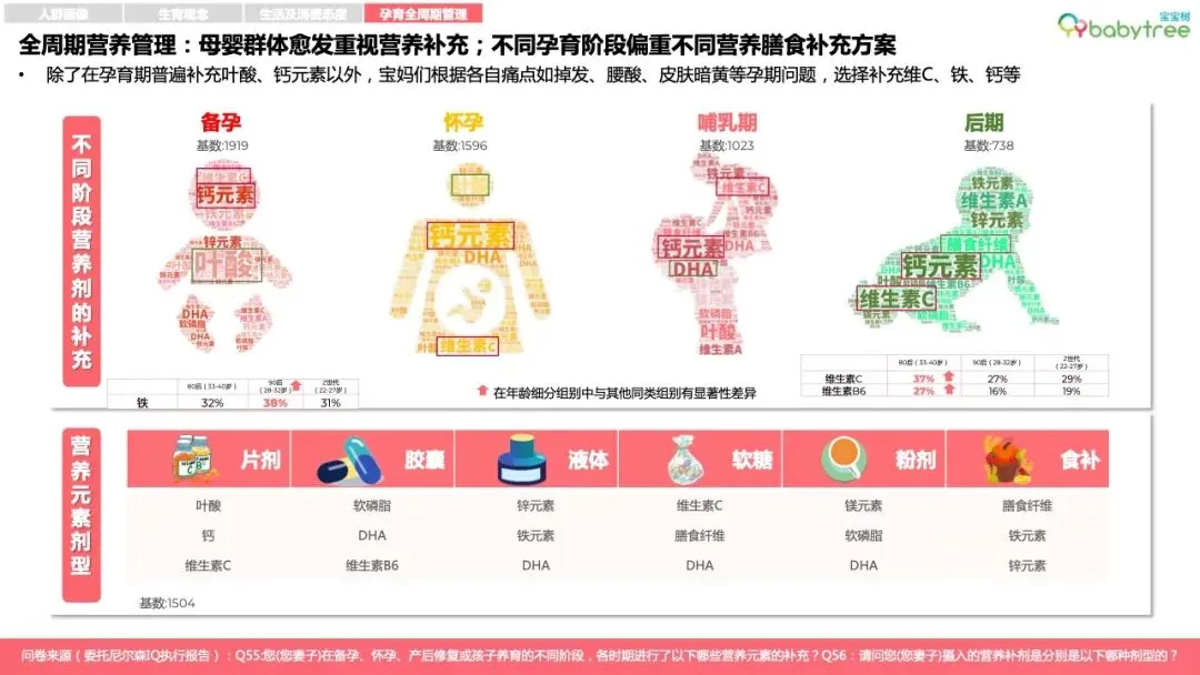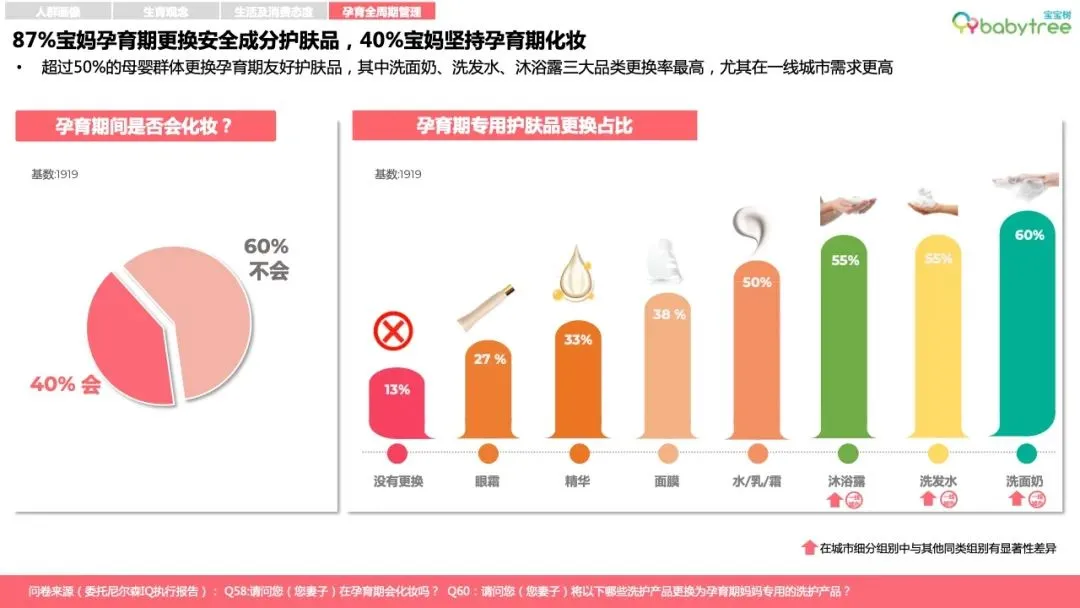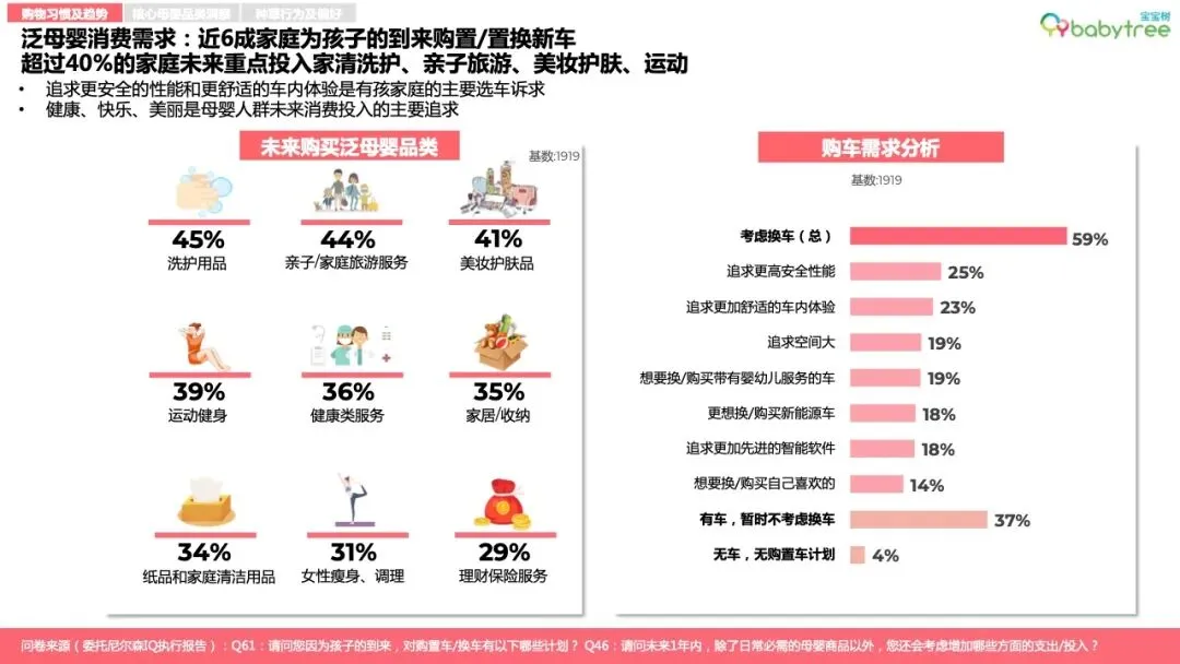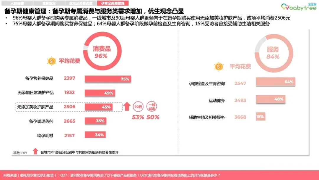 96%的母婴人群备孕会购买专属消费品,如备孕营养品、孕妈友好型洗护及化妆品等,87%宝妈孕育期会更换安全成分护肤品;近6成家庭会为孩子的到来购置或置换新车。
