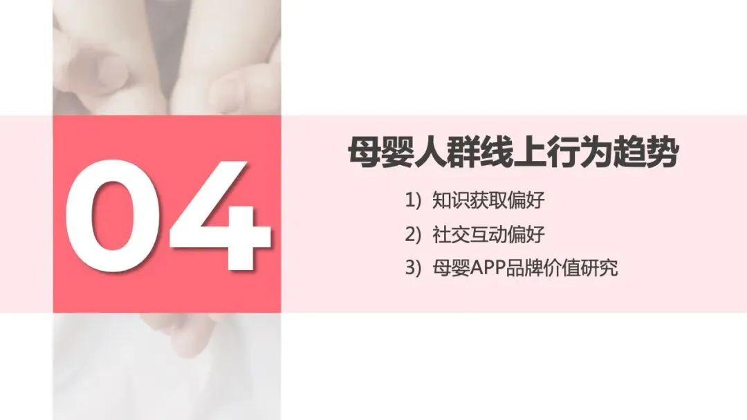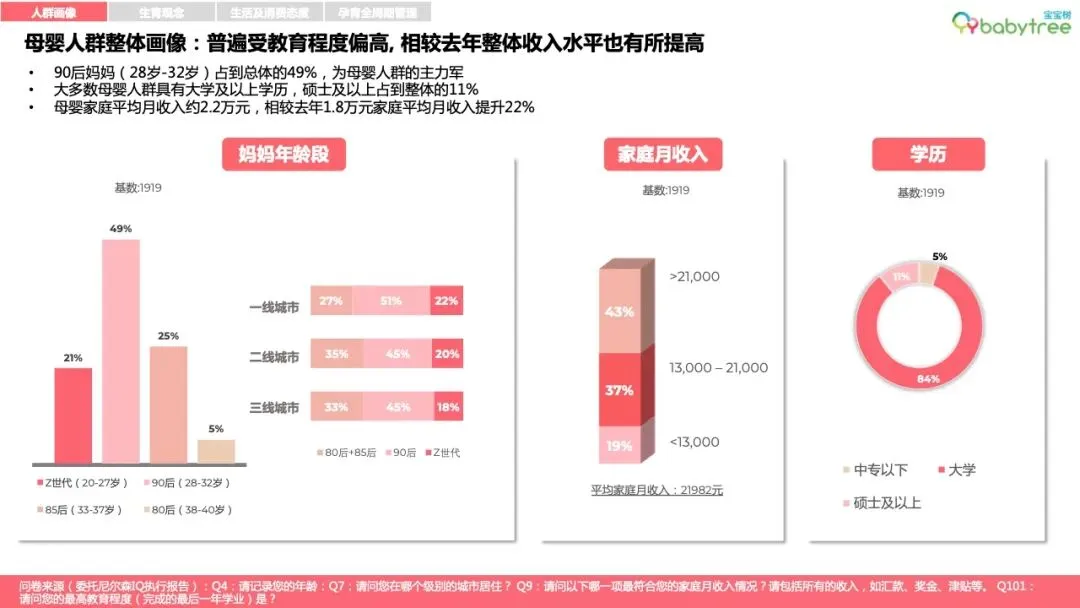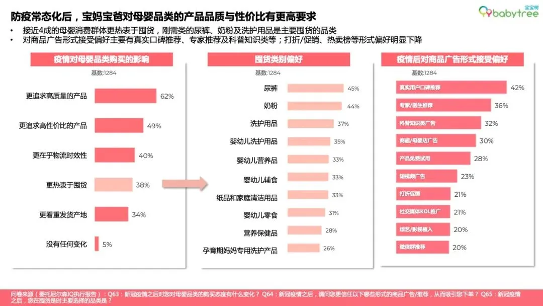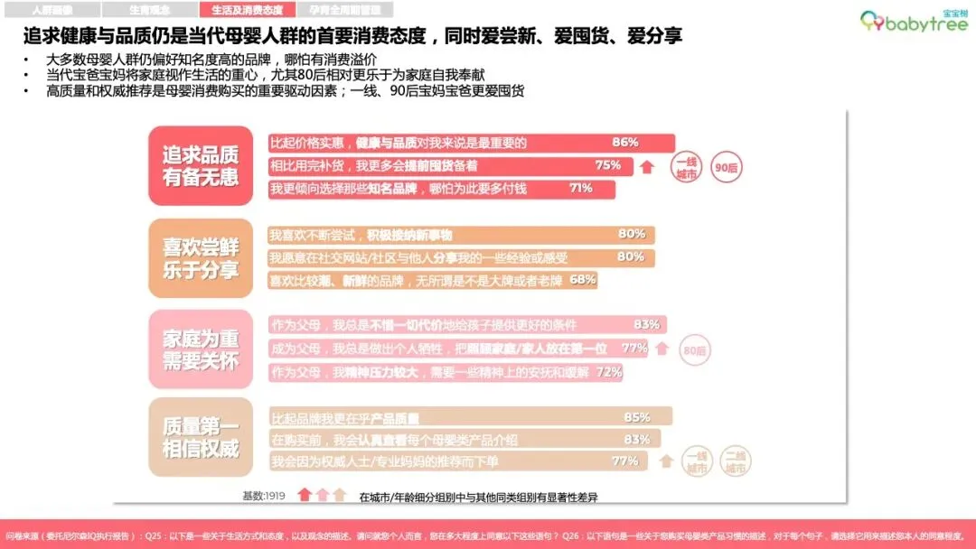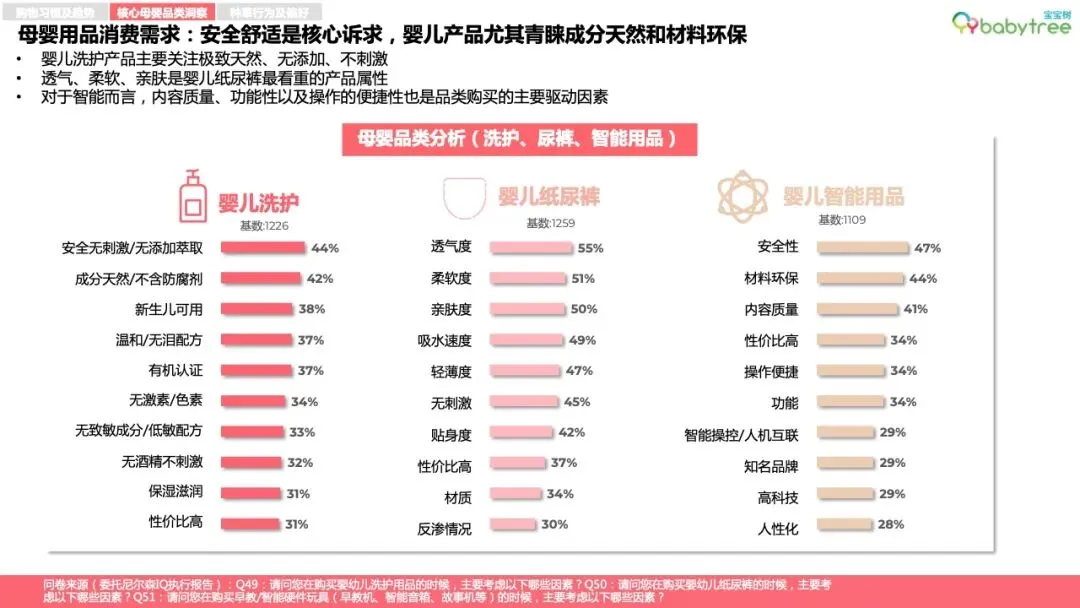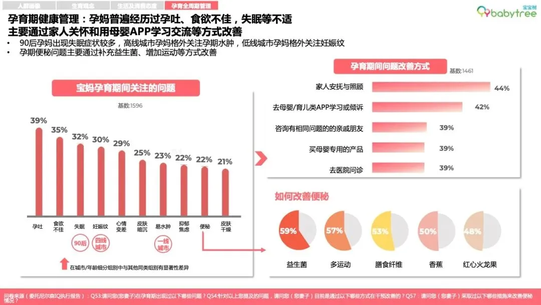 96%的母婴人群备孕会购买专属消费品,如备孕营养品、孕妈友好型洗护及化妆品等,87%宝妈孕育期会更换安全成分护肤品;近6成家庭会为孩子的到来购置或置换新车。