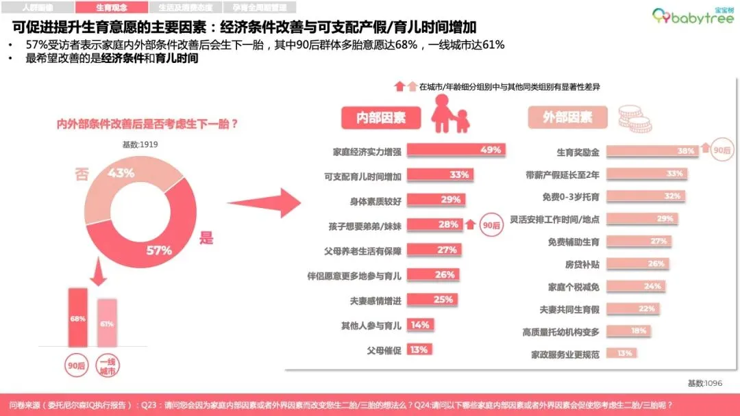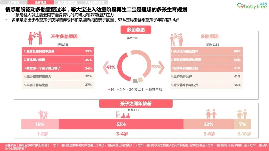 现有一孩家庭渴望改善经济条件、增加育儿时间。90后家庭生育多孩意愿较高,超过半数的宝妈宝爸认为孩子之间理想年龄差为3-4岁。