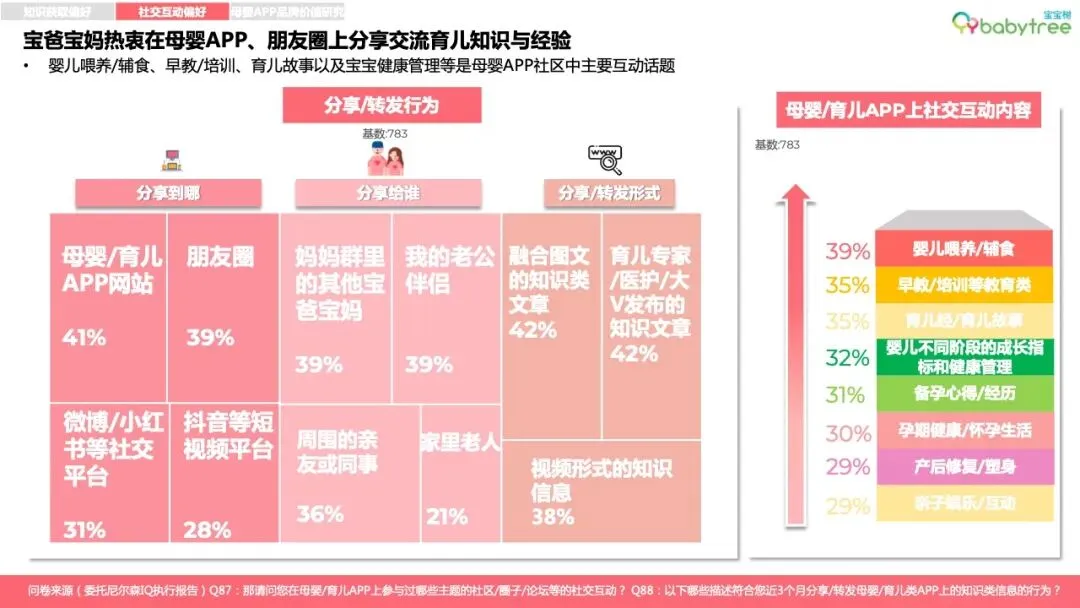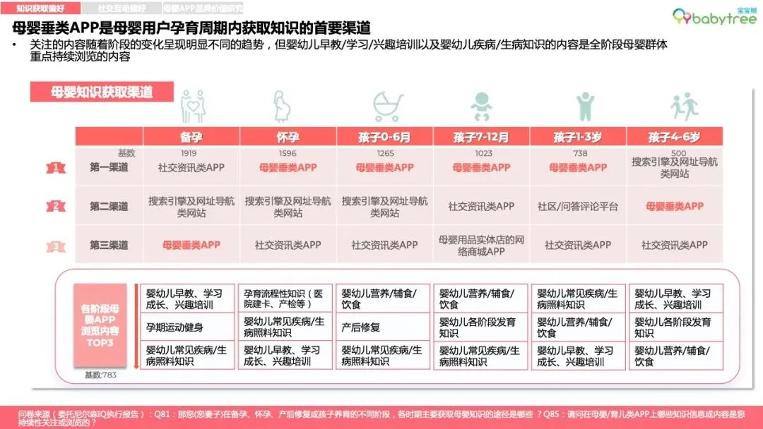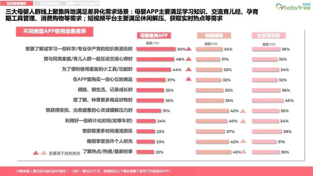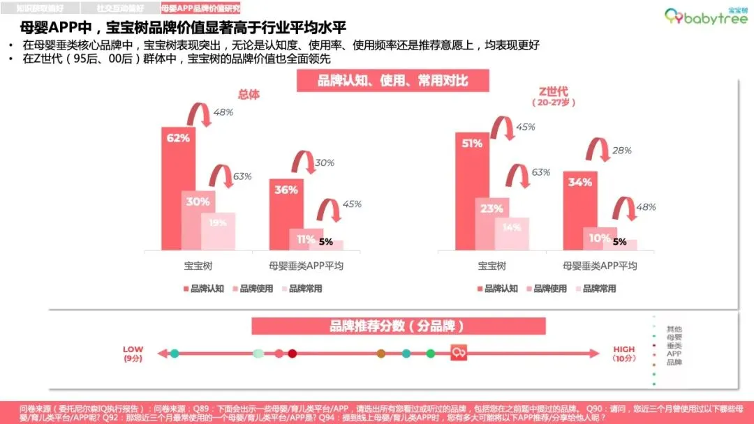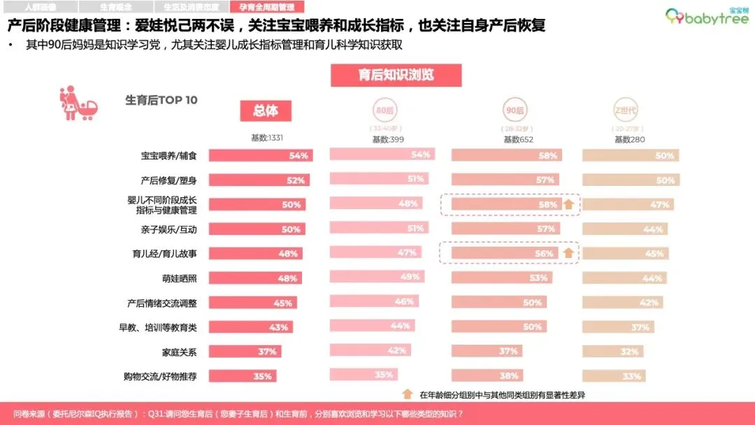 新一代家长普遍为“学习党”,尤其关注婴儿成长指标管理和科学育儿知识获取,主要用母婴App学习、交流、孕育工具管理、消费种草。宝宝树是宝妈宝爸的首选专业母婴App,尤其95后、00后对宝宝树认知度、使用度显著高于其他App。