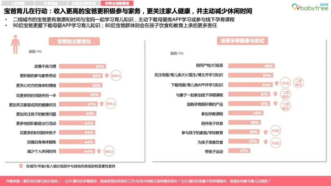 收入较高的宝爸更愿意主动参与育儿和家务;二线城市的宝爸则更有意愿和时间与宝妈一起学习育儿知识;90后宝爸倾向于下载母婴App学习育儿知识;80后宝爸群体则会在孩子饮食和教育上承担更多。