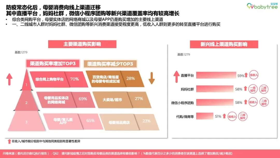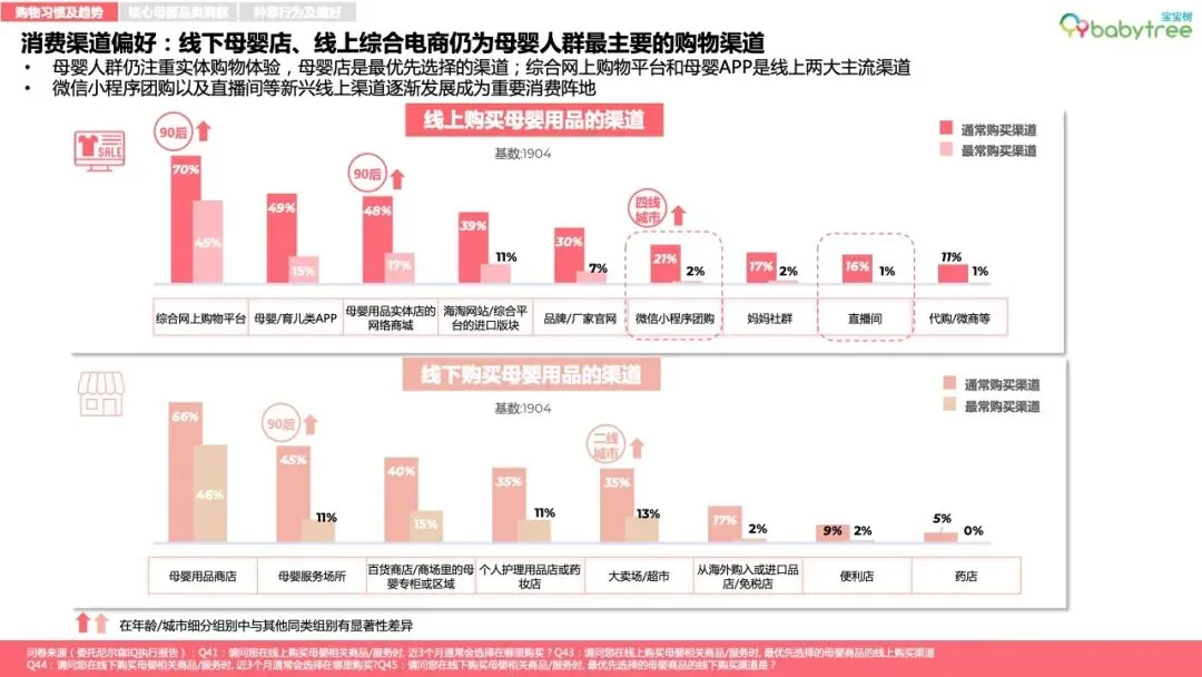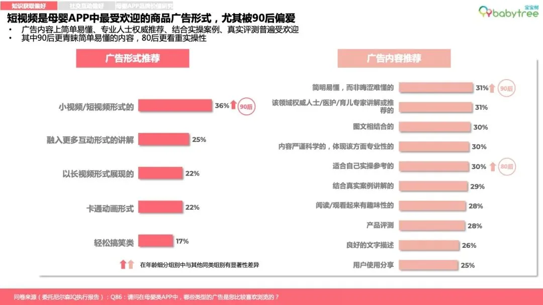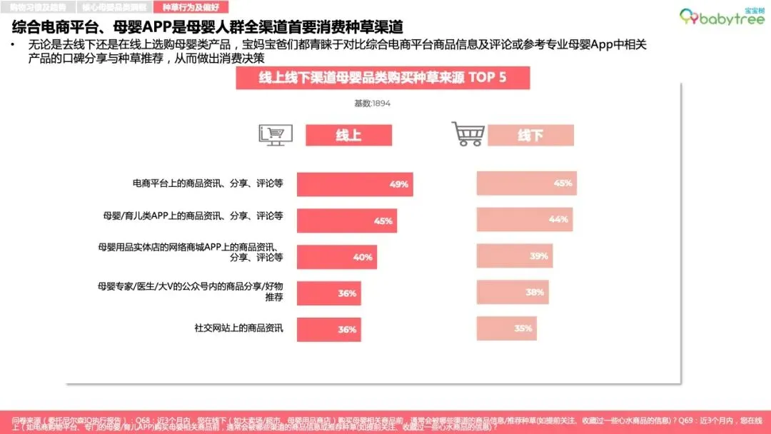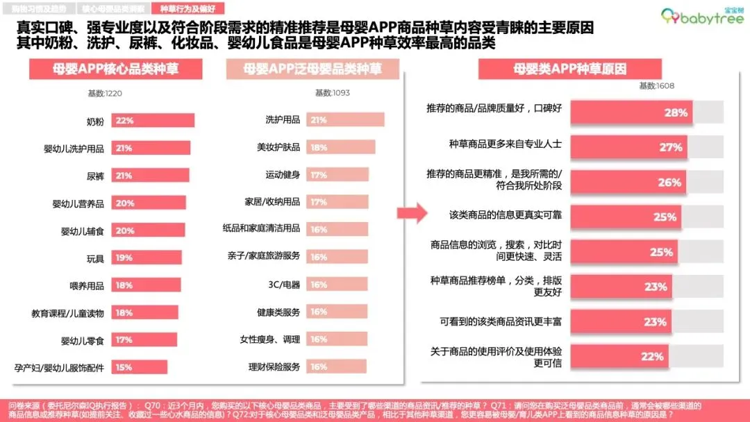综合电商平台、母婴类App成为母婴群体购物时最重要的消费种草渠道。真实口碑、强专业度以及符合阶段需求的精准推荐是母婴App商品种草内容受青睐的主要原因,短视频是较青睐的种草广告形式。
