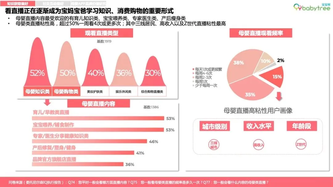 直播正在逐渐成为宝妈宝爸学习知识、消费、购物的重要形式。88%的人每周看2次以上直播;三线城市、高收入95后是直播粘性最高的群体。