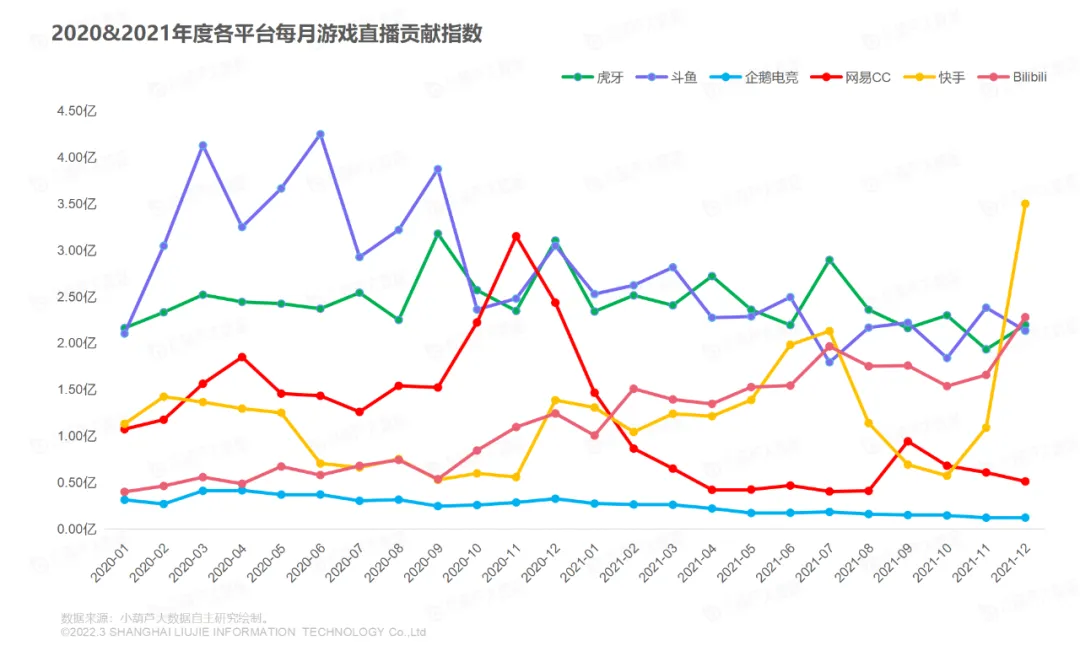 虽然行业整体发展不如2020年,但是也有平台在如此艰难的环境下做到了“逆生长”,比如B站,尽管它进场较晚,但是它的贡献指数持续走高,甚至在2021年游戏直播月贡献指数一度达到2.28亿。与B站比较,游戏直播老牌平台的月贡献指数内容也是可圈可点。比如斗鱼平台,2021年它的直播月贡献指数依旧很高,最高曾达到2.82亿。虎牙平台月贡献指数最高为2.89亿。