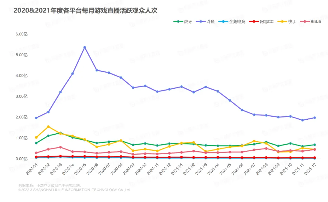 以上数据统计平台:斗鱼、虎牙、B站、快手、网易CC、企鹅电竞