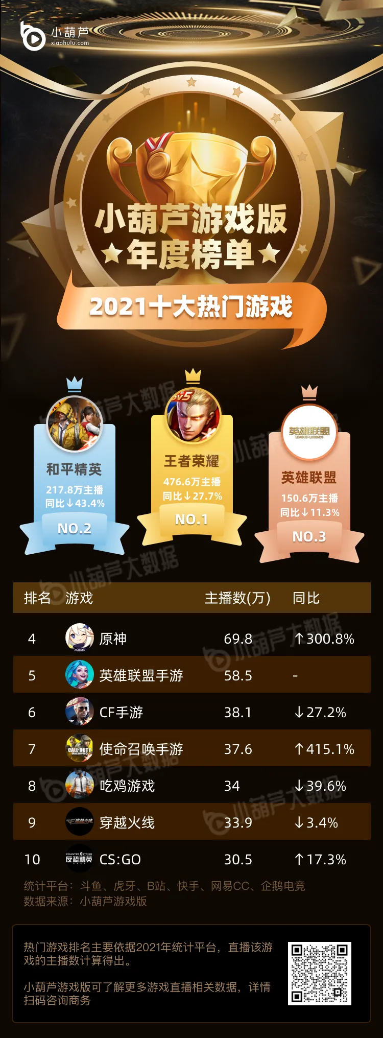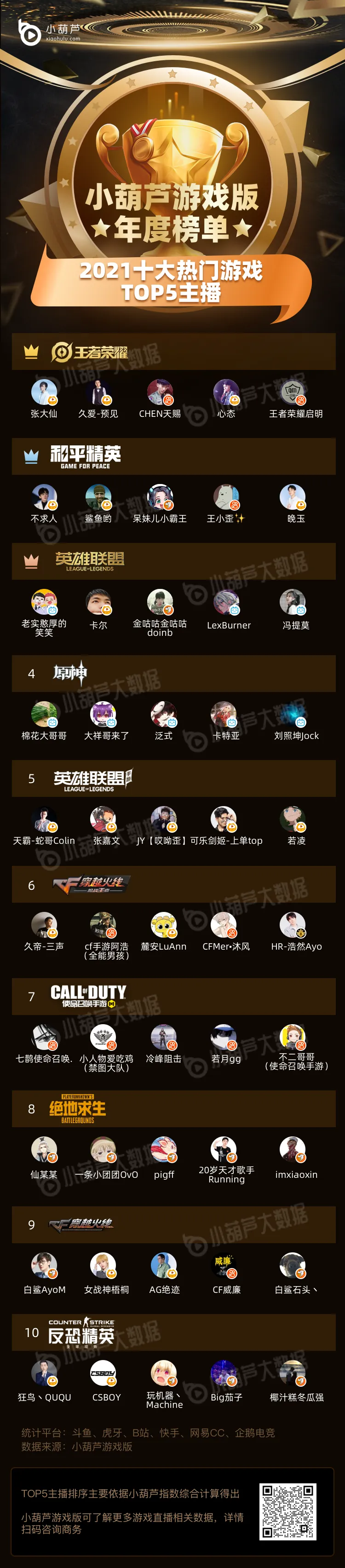 有热门的游戏自然也有游戏直播中玩家最喜欢的主播,那么小葫芦评选出的2021十大热门游戏,其对应的热门主播分别是谁?