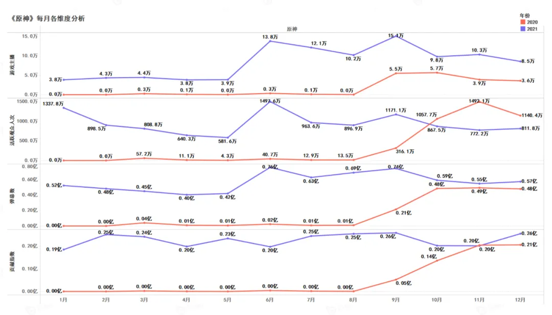 除去前三外,TOP.4米哈游发行的《原神》直播表现十分突出,上升空间极大。2021年正是《原神》进入运营的第二年,曾经许多评论认为当玩家最初的好奇感过后,《原神》将面临热度下滑、被玩家抛弃的局面。却没有想到,这款手游吸引了69.8万主播对它的相关内容进行直播,而这一主播数据较2020年同比上涨近300.8%。并且由于游戏的不断更新与优化,越来越多的玩家开始喜欢这款游戏。尤其下半年新版本内容的好评不断,更是为游戏相关直播带来了整体活跃观众人次、弹幕数、贡献指数不断上涨,2021年观众人次最高峰值出现在11月1492.1万。