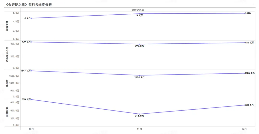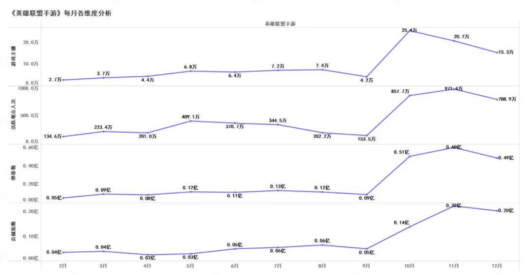 值得一提的是,《英雄联盟手游》在公测后直播热度一直居高不下,尤其是9月至11月期间,因为LPL电竞赛事的开启也为这款同名手游带来了相当高的热度和话题。基于此,《英雄联盟手游》活跃观众人次最高峰值971.4万、弹幕数最高0.6亿、贡献指数最高0.22亿均出现在11月。