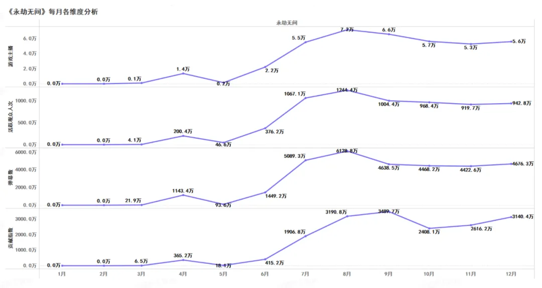 作为PC游戏的《永劫无间》能在众多手游产品中杀出重围登上TOP.2的位置实属不易。这款于7月8日开启国服不删档测试的产品,由于产品自身的高质量,以及国民共有的武侠情怀,使得游戏从开售以来就深受玩家喜爱,而与它有关的直播也备受关注。从7月到12月,直播这款游戏相关内容的游戏主播最高峰值为7.2万,活跃观众人次最高为1244.4万,弹幕最高为6128.8万,贡献指数最高为3489.7万。