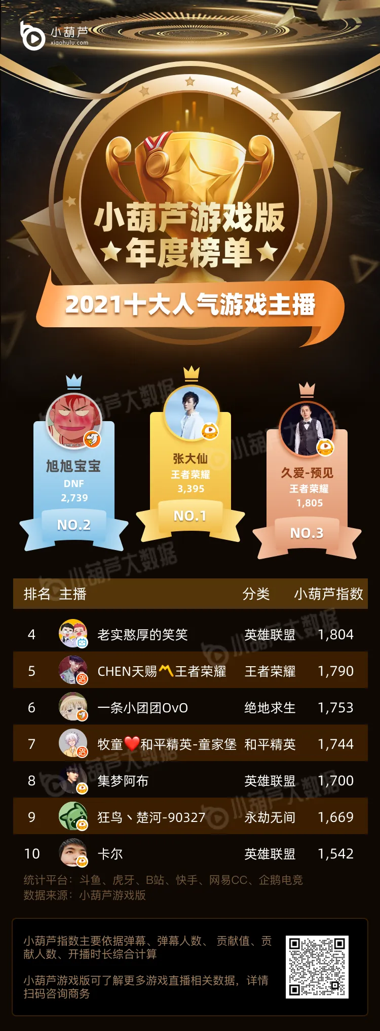 最受观众欢迎的游戏主播会花落谁家?“2021十大人气游戏主播”榜单显示:来自虎牙平台,主播《王者荣耀》的张大仙最受观众欢迎,小葫芦指数3395;TOP.2为斗鱼平台,主播《DNF》的旭旭宝宝,小葫芦指数2739;TOP.3是同样来自虎牙平台主播《王者荣耀》的久爱-预见【吕德华】,小葫芦指数1805。