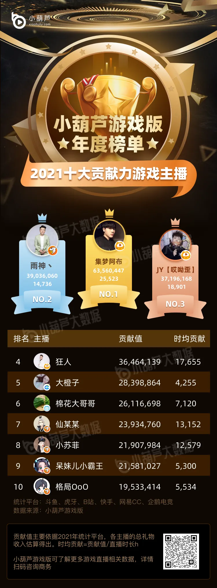 有最热门的主播排名,也一定会有贡献值最高的主播榜单,小葫芦依据统计平台,各大主播的总贡献估算得出“2021十大贡献力游戏主播”榜单。其中,TOP.1是虎牙平台的集梦阿布,贡献值高达6356万,时均贡献2.5万;TOP.2为斗鱼平台的雨神丶,贡献值3903万,时均贡献1.4万;TOP.3是虎牙平台的JY【哎哟喂】,贡献值3719万,时均贡献1.8万。(注:时均贡献=贡献值/直播时长h)