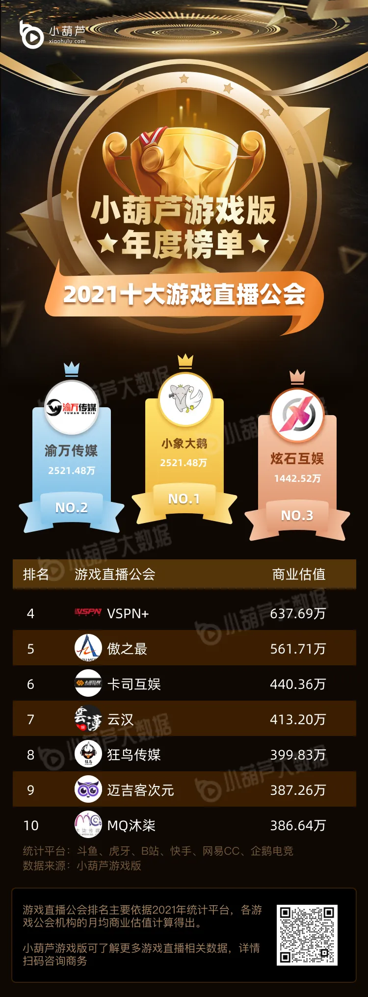 除去对主播、最受主播青睐的游戏产品进行估算和总结外,小葫芦还根据游戏直播公会月均商业估值计算得出综合商业估值,并以此为依据进行了“2021十大游戏直播公会”排名。在榜单前三的商业直播公会分别为:TOP.1小象大鹅,商业估值2521.48,其主播人数相较2020年同比上涨160.27%;TOP.2渝万传媒,商业估值2521.4,主播人数同比上涨118.98%;TOP.3炫石互娱,商业估值1442.52,主播人数同比上涨107.08%。