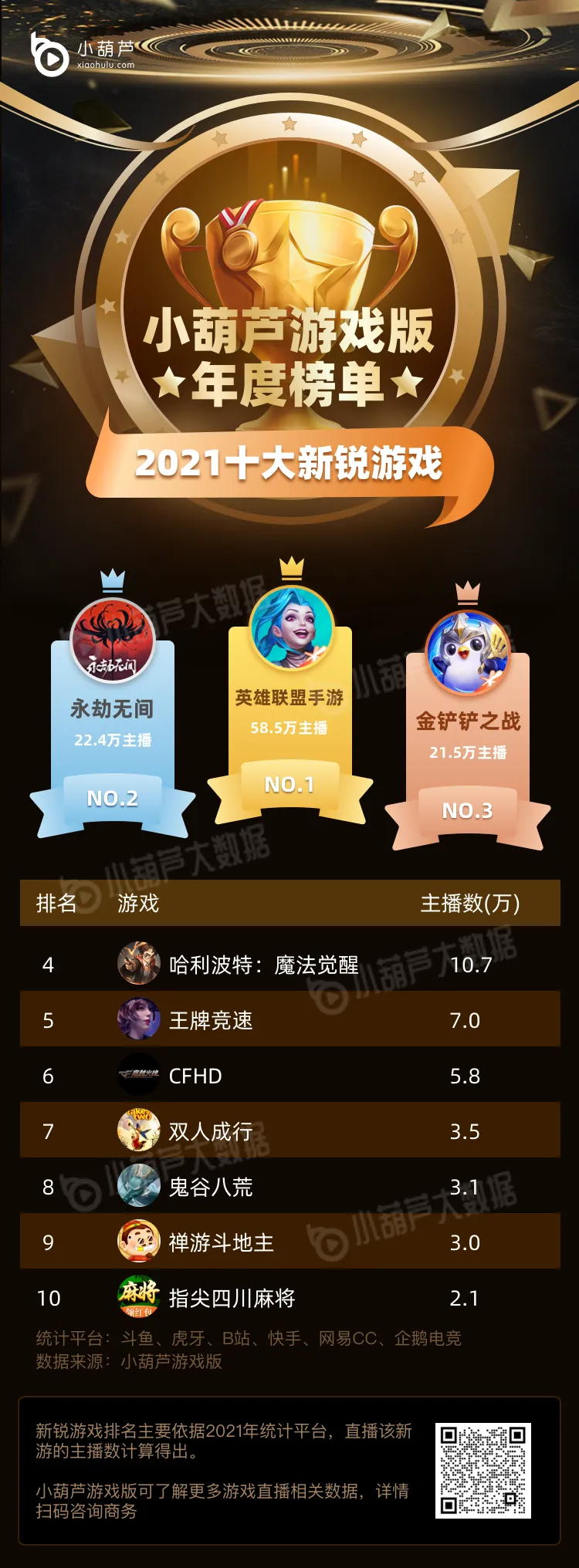 主播最喜爱直播的新游是哪些?小葫芦根据新游在各大主流平台的主播数量统计出了“2021十大新锐游戏榜单”,其中TOP.1是腾讯发行的《英雄联盟手游》,TOP.2网易发行的《永劫无间》,TOP.3是腾讯发行的《金铲铲之战》。
