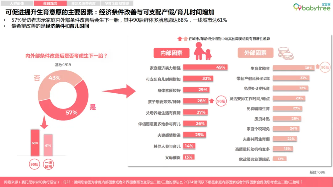 《报告》显示,母婴市场规模依旧保持逐年增加,并且在居民可支配收入提高、消费升级、消费理念改变等多因素共同促进下,从2021年4.78万亿元的总规模向5万亿元的门槛迈进,增长率较去年反弹达到近20%,成为近5年来的新高点。目前,母婴消费市场中线下渠道仍占主导地位,其中母婴渠道过去三年复合增长率1.8%,受疫情影响本年降低3.7%。线上渠道销售额则是稳中有升,在2022年第一季度实现2.9%领涨,尤其是婴儿奶粉,婴儿护肤,吸奶器三大品类增幅最大,其中婴儿奶粉同比增速 2.3%,吸奶器同比增速 6.1%,都有着较强的增长潜力。与此同时,婴配粉、纸尿裤、洗护用品三大重点细分品类赛道主要呈现出:1)国潮母婴品牌向高线城市发力;2)成分党、功能党消费群体驱动母婴品类增长;3)消费周期向幼童阶段延伸;4)高端产品驱动品类增长,低线城市高端产品消费能力拉升的四大趋势。90后群体多胎意愿达68%,