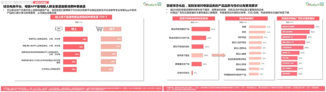 从《报告》的母婴人群画像部分知悉,新生代父母追求健康与品质的消费态度,爱尝新、爱囤货、爱分享,尤其热衷在母婴APP、朋友圈上分享交流育儿知识与经验。比如二线城市宝爸尤其是90后宝爸,更有意愿和时间与宝妈一起学习育儿知识,主动下载母婴类APP学习或参与线下孕育课程,深度参与育儿全程。同时调研报告显示,大多数母婴人群仍偏好知名度高的品牌,哪怕有消费溢价。尤其防疫常态化后,宝妈宝爸对母婴品类的产品品质与性价比有更高要求。不过疫情也同步致使母婴消费习惯向线上渠道迁移,综合类网购平台,母婴实体店的网络商城以及以宝宝树为代表的母婴垂类APP仍为母婴消费群体线上渠道的主要集散地,其中综合类网购平台占据70%。但无论是线下还是线上消费,打折/促销、热卖榜等对母婴消费群体决定购买的影响力减弱,新生代宝妈宝爸们做出消费决策,都更青睐于参考专业母婴App中相关产品的口碑分享与种草推荐,其中真实用户口碑推荐为42%,专家/医生推荐占36%。另外,奶粉、洗护、尿裤、化妆品、婴幼儿食品是母婴APP种草效率最高的品类。消费种草价值等维度高于行业平均10%,