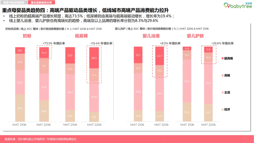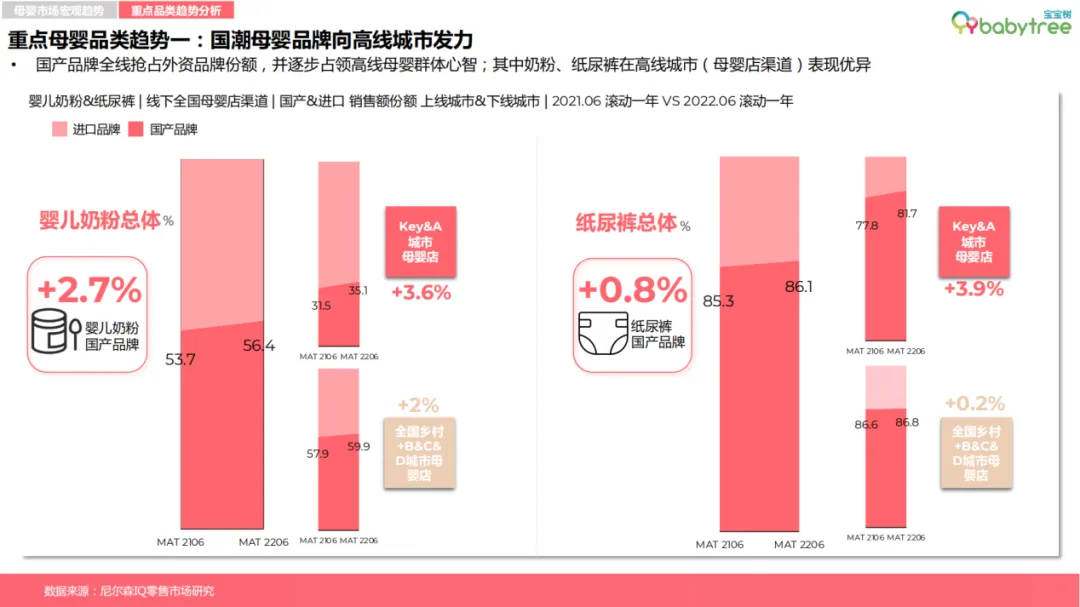 而在一众母婴垂类APP核心品牌中,宝宝树凭借在内容层面更合理,更全面,更实用,赢得Z世代(90后、00后)母婴群体的信任与青睐。正向反哺下,宝宝树在核心母婴品类的消费种草价值要明显高于行业平均水平,并同期在体验满意度等维度维度亦是高于行业平均水平10%,实现品牌价值的全面领先。终端的高分好评,足以验证宝宝树在母婴垂类平台的“头雁”地位,但创新时代,只有勇于攀登更高的山峰才能领略无限的风光。因而,为了进一步借助专业化、品质化内容让好商品更高效出圈,宝宝树坚持优质内容生态打造,并于8月25号宣布启动“星推计划”,面向优质创作者,力促“好内容匹配好品牌”,让品牌和消费者同时受益。另据《报告》数据显示,目前母婴消费市场国产品牌已全线抢占外资品牌份额,并逐步占领高线母婴群体心智。以奶粉、纸尿裤为例,截至2022年6月数据,国产婴配粉全渠道销量占奶粉销售总量的56.4%,同比增长2.7%,同期国产纸尿裤品牌以86.1%的高份额占比,强势碾压外资品牌。国潮品牌受到消费者欢迎的背后,既有品牌在品质上的精耕,亦有如宝宝树等线上母婴垂类平台的助推。资料显示,宝宝树一直专注内容IP的打造,目前已相继推出宝宝树研究院、《中国ZHI造》、《辣妈训练营》、爱己月、美囤宠粉节等多个热门项目,其中《中国zhi造》便是应母婴“国潮”崛起趋势而定制设计打造的一档节目,通过展示国货品牌背后工厂等硬实力,借助专家、达人、宝宝树用户等视角多维解读,帮助母婴消费群体进一步深入了解国产品牌。值得一提的是,随着后疫情时代母婴消费观念与行为的改变,宝宝树在成立15周年之际,全新升级品牌愿景与使用,将致力于"构建全球母婴家庭幸福生态系统",从线上社区到复合生态、从备孕到怀孕到育儿全周期的产品及服务体系,并对外公布通过C2M智选商品模式深度链接国内头部供应链企业成为公司下阶段的重要业务发展方向。其实早在去年,宝宝树旗下C2M业务的经营策略就进行了聚焦升级,并且围绕“六高一独”的选品策略,日前已推出了专注孕期肌肤护理需求,提供安全温和修护保湿的孺期“赋活瓶”,以及迎合孕产前后女性的肠道养护、健康健美需求所研制的,益生菌浓缩西梅纤维饮料的美囤“轻松瓶”。另外从《报告》中获悉,线上婴儿浴液、婴儿护肤也有高端化的趋势,高端及以上品牌的增长率分别为8.3%与29.6%。而在近期,宝宝树C2M又聚焦家庭洗护场景,推出了婴童洗护系列产品——孺期婴幼儿二合一洗发沐浴露、孺期婴幼儿舒缓保湿润肤乳液、孺期婴幼儿舒缓保湿护臀膏,又再一次精准聚焦成分党、功能党新生代父母的消费需求。就此不难发现,宝宝树已在加速卡位新生代母婴家庭用户细分场景下的消费心智,未来C2M战略也将成为宝宝树业绩拉涨的重要引擎。机遇永远留给有准备的人,母婴行业在人口红利减少的承压下,依旧保持着朝阳属性,而集流量价值、消费种草价值于一体的宝宝树,正在以先瞻性布局为母婴家庭人群提供更高标准的产品与服务,未来可期。