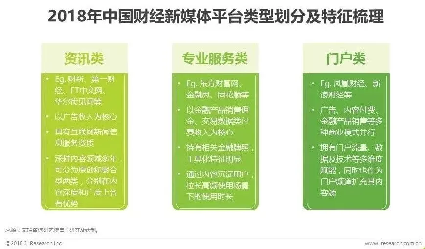 2015-2016年,伴随着各大媒体平台纷纷布局自媒体、不断推出激励政策,自媒体快速发展,其中,财经类自媒体作为财经内容的重要来源之一,数量持续增长;另一方面,在产业环节中兼具内容生产与渠道分发角色的财经新媒体平台,也在从单一文字内容向音视频多元形态探索,从单纯信息陈列向分析服务输出扩展,并对应用户资产配置需求点,开拓多个细分垂直领域,如外汇、期货、海外投资等。整体而言,财经资讯内容来源不断分散,内容种类正在扩充。