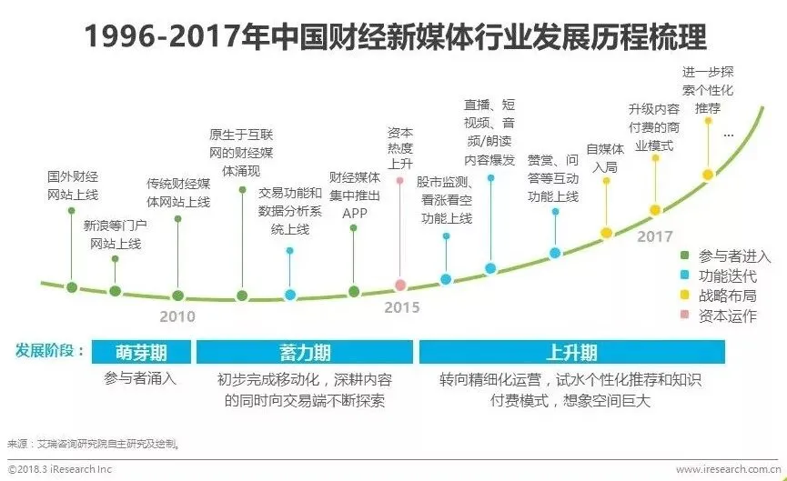 经历过参与者集中涌入的萌芽期、一边向移动端转移一边进行多元探索的蓄力期,目前财经新媒体行业正处于快速上升阶段: